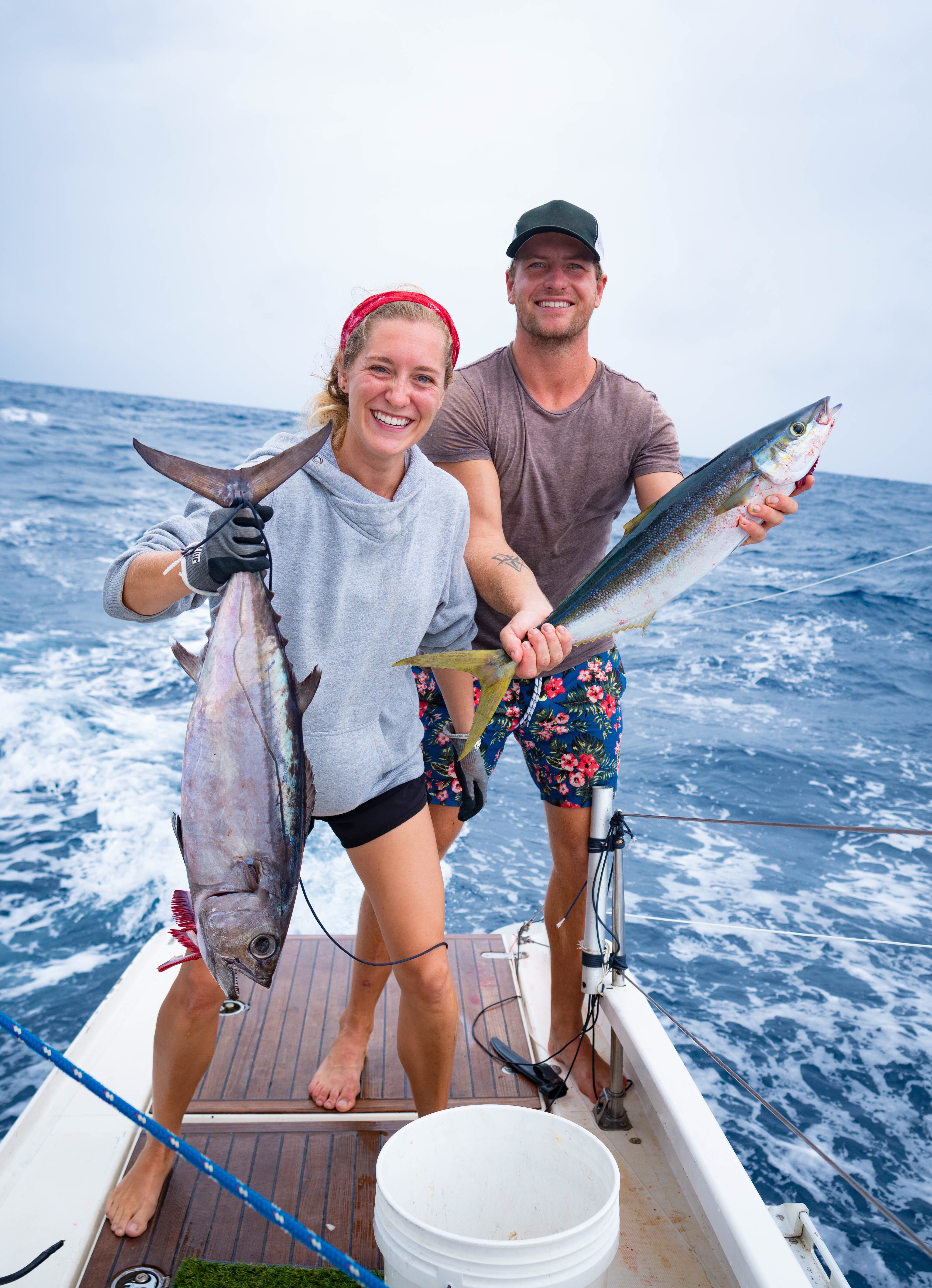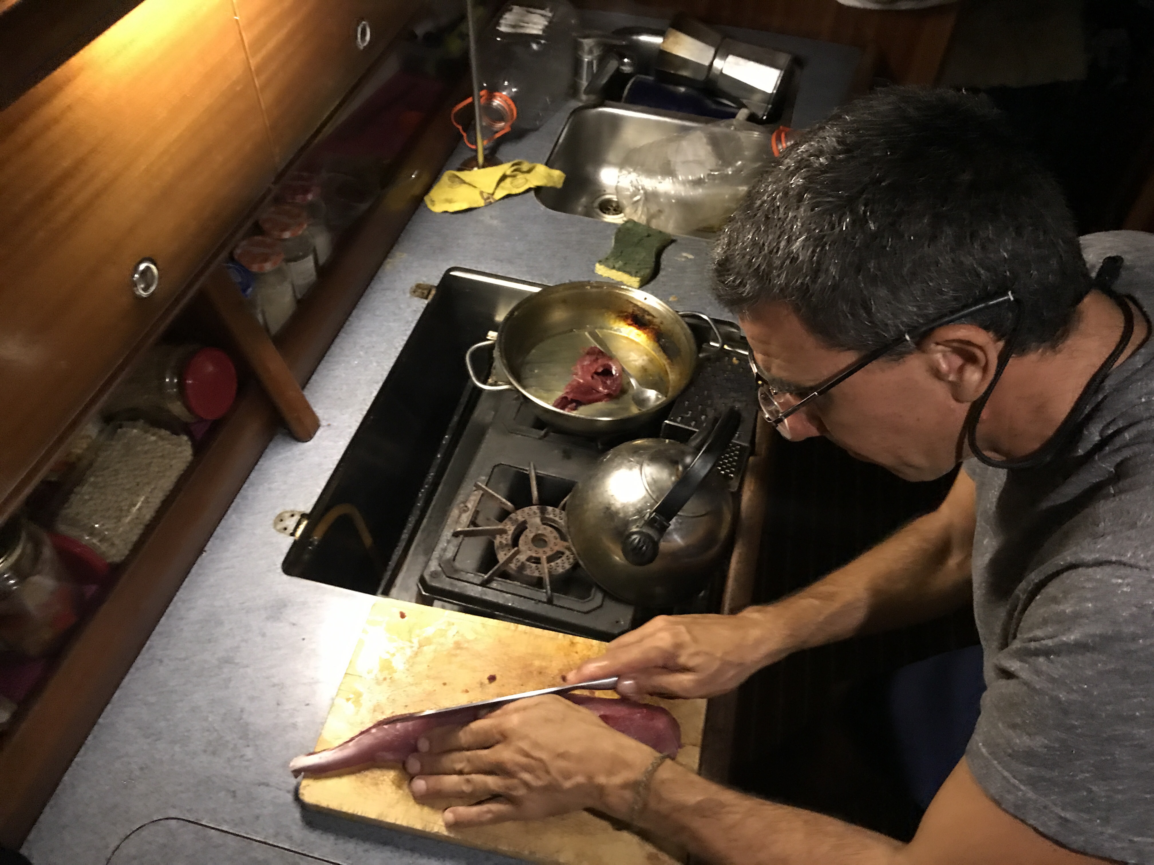 We arrived to port with a 10 foot long Pacific Blue marlin newly processed and filling up our two freezers. It’s regal bill and flashy tail cut free from the shimmering blue silver body, ready to dry and be a physical reminder of the great beast. We caught it on a hand line, Eric wrapped the line around a winch and I winched it in.  By the time it reached the boat, it had dragged at 11 knots forcing blood through its gills, so it didn’t have any fight left. It was a wild honor to be near the majestic beast and it’s silky, clean flesh fed us and many others for months.