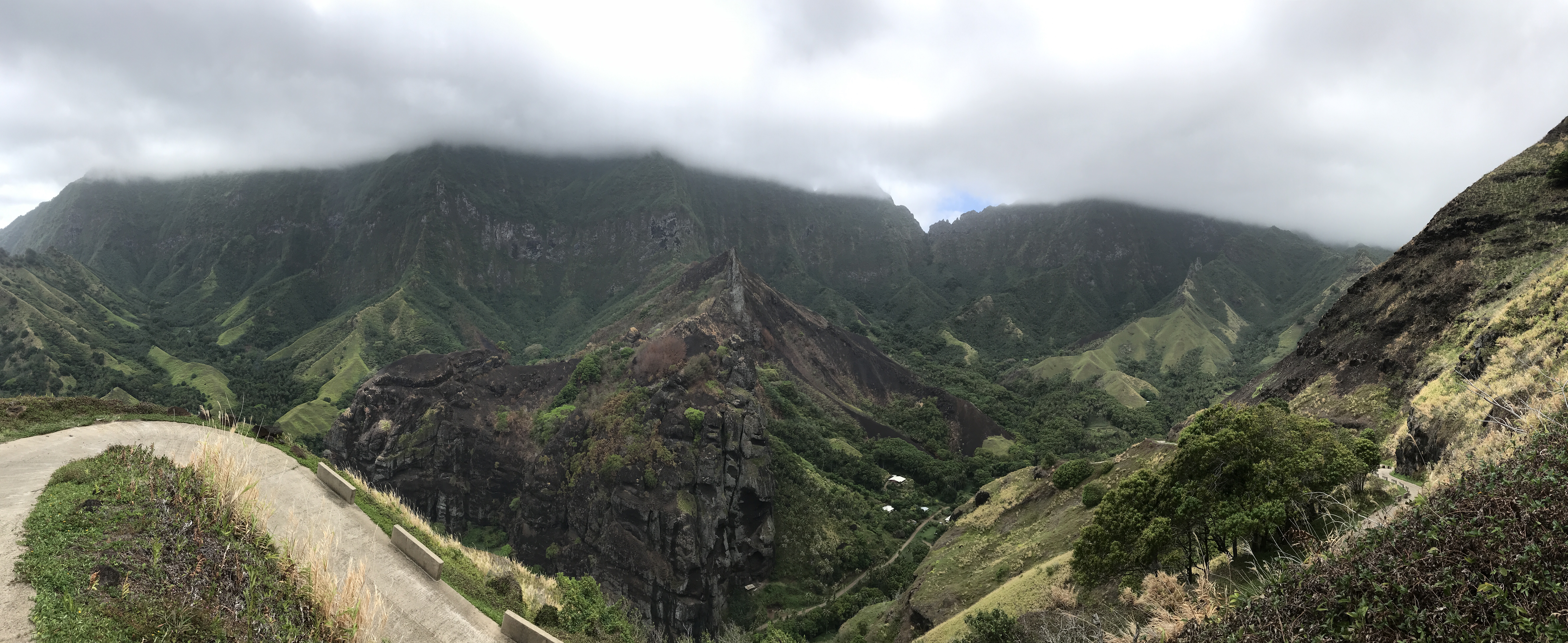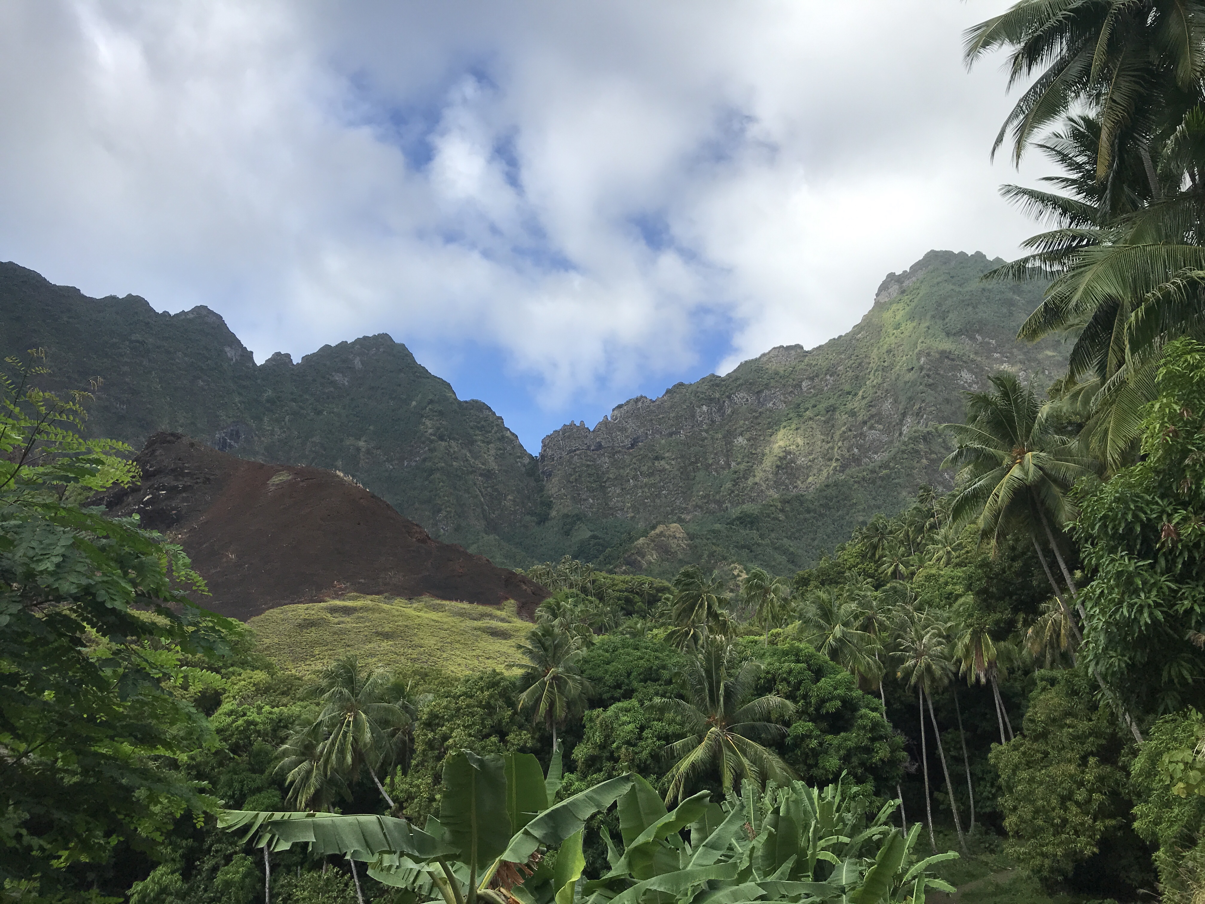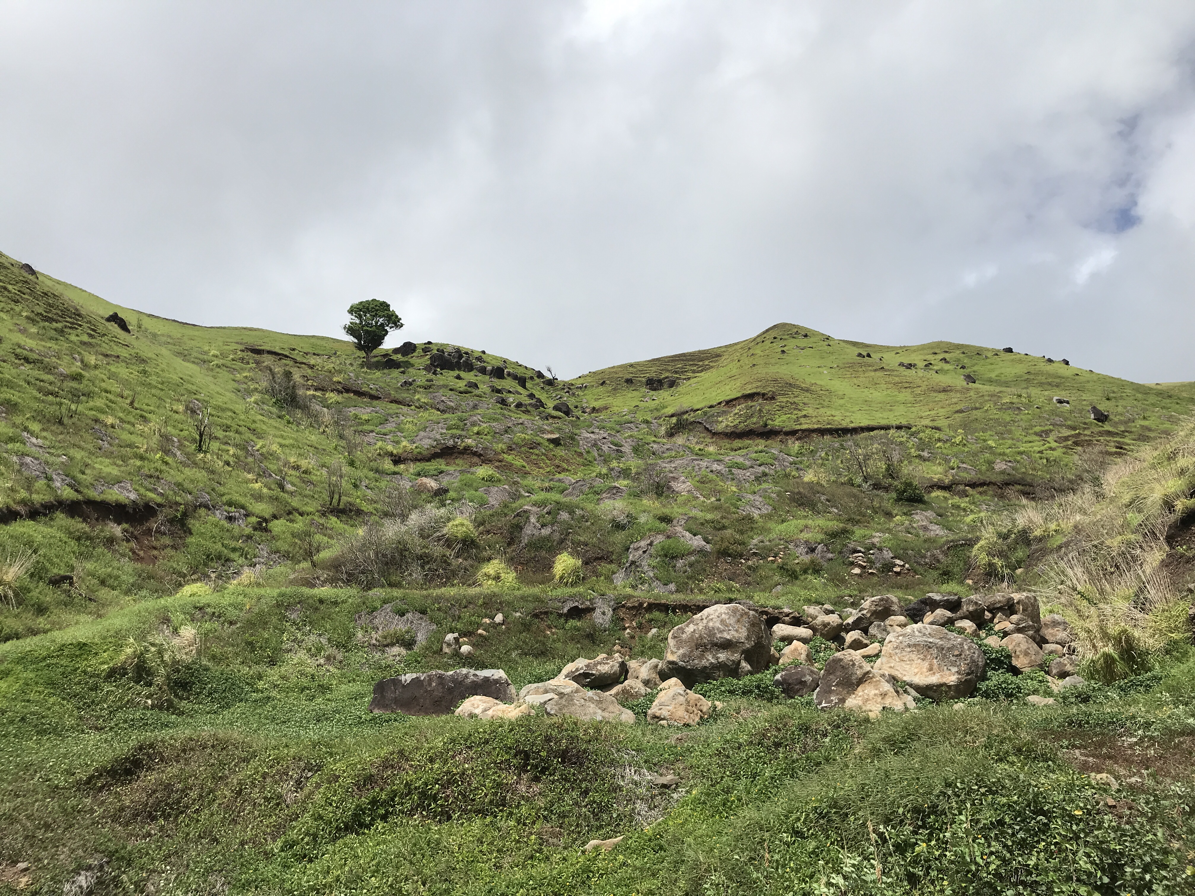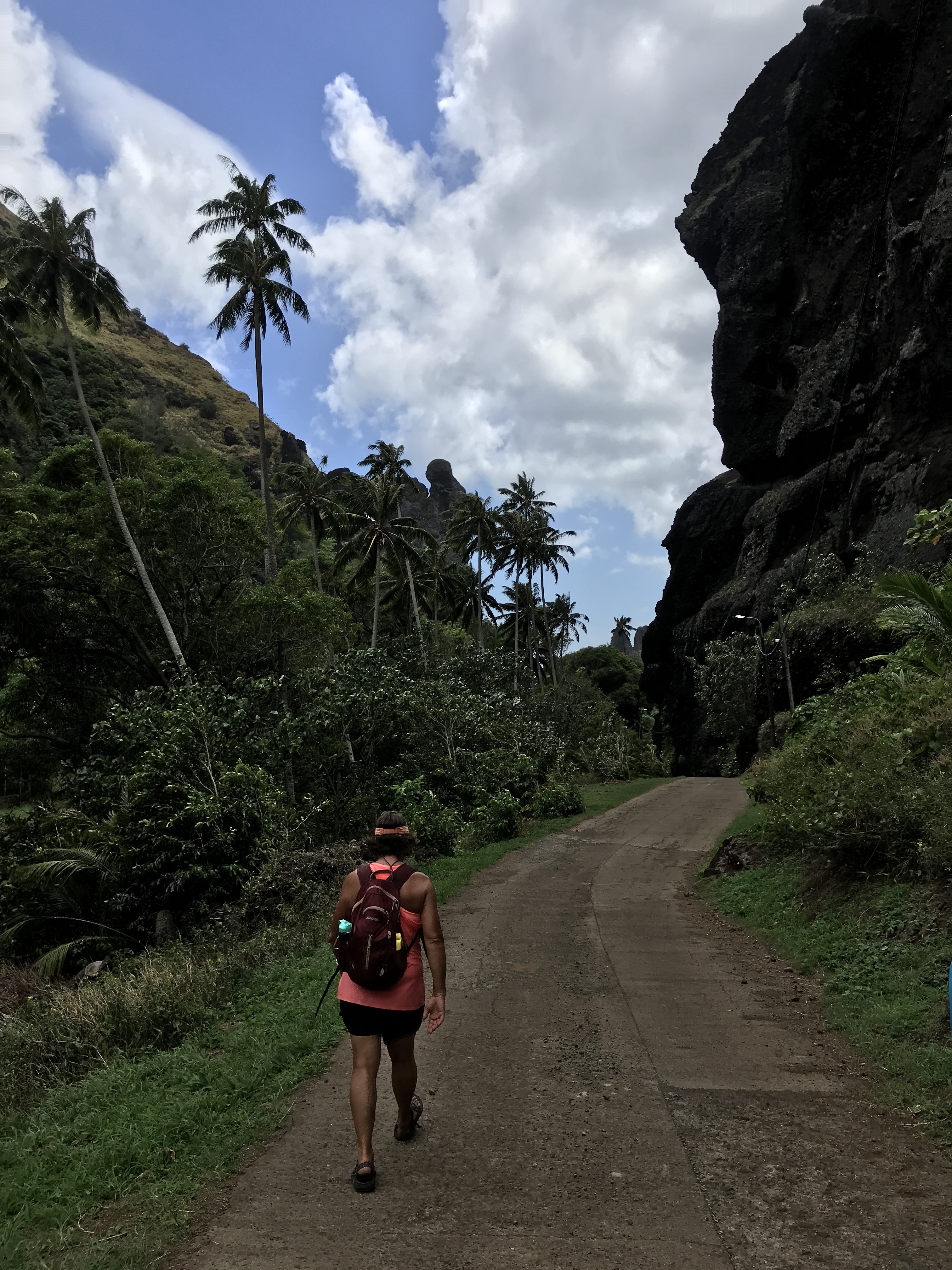 Did I mention up? UP. The hike was steep, especially for our boat bodies. I plodded, still recovering from fever aftermath, while Susan bounded on along. Greg disappeared out in front and Diane was more or less between me and Susan. The wind gusted more intensely as we climbed, dense misty clouds hugged the top of the cliffs surrounding the valley bowl. White smoke rose from a coconut grove tucked into a valley nook. It felt like a dreamscape with bright sunlight highlighting new plant growth in the foreground, while muted overcast light kept the steep valley and cliffs in the twilight zone beyond.