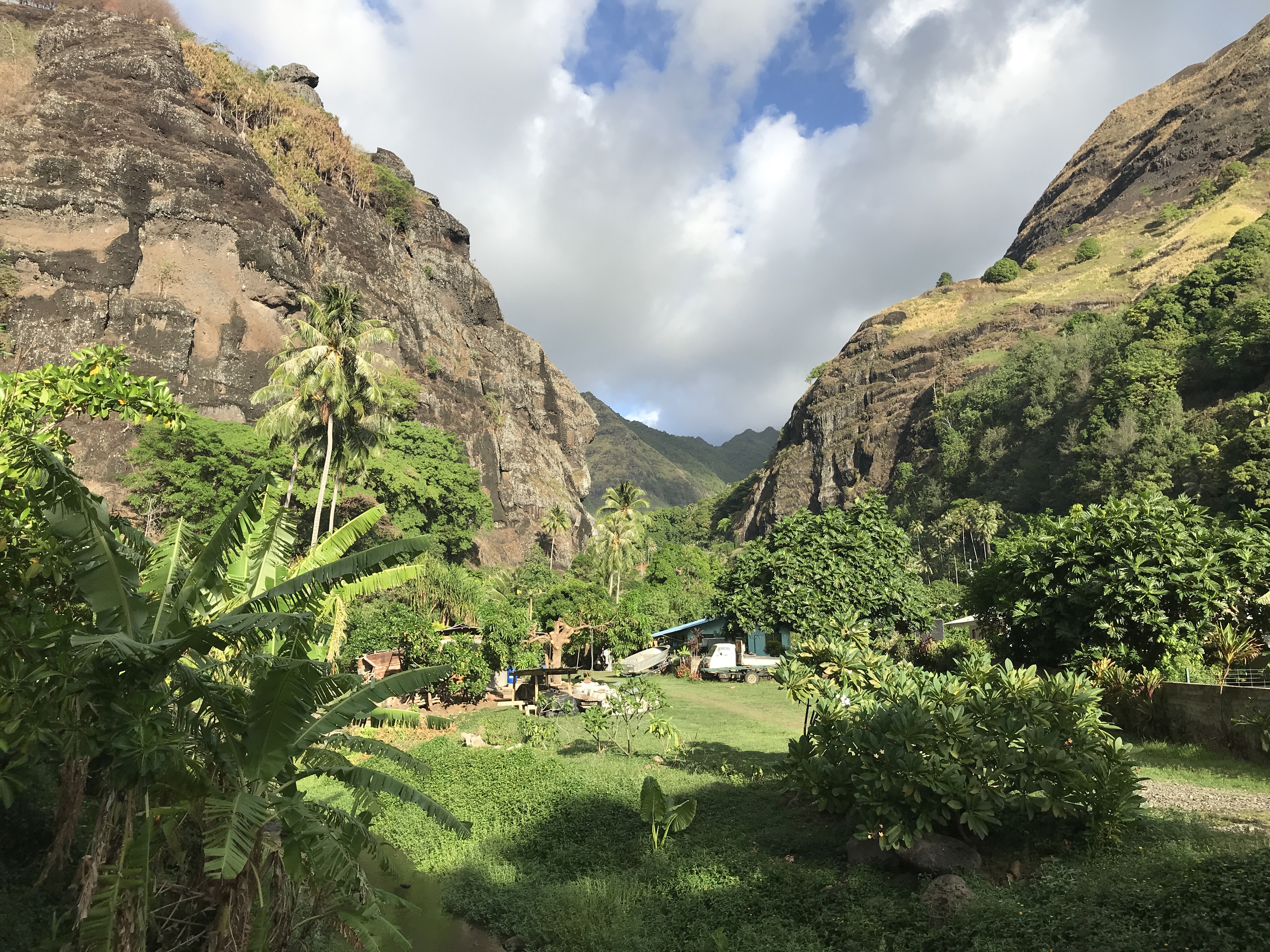 Today we enjoyed the feeling of land under our feet for a few hours. We walked up through town, past the soccer field, church and school. Susan bought a dozen eggs at the corner store and I walked back to place them gently in the dinghy. We continued along the river flanked by modest one story homes, patterned fabric swaying in the windows and doorways, each with their freshly painted boats, copra (coconut meat) drying areas, crew of roosters, dogs and goats. Friendly folks invited us to lunch tomorrow at their home, we exchanged easy “bounjour” and “kaoha” salutations with people as we continued along the cement road up into the valley.