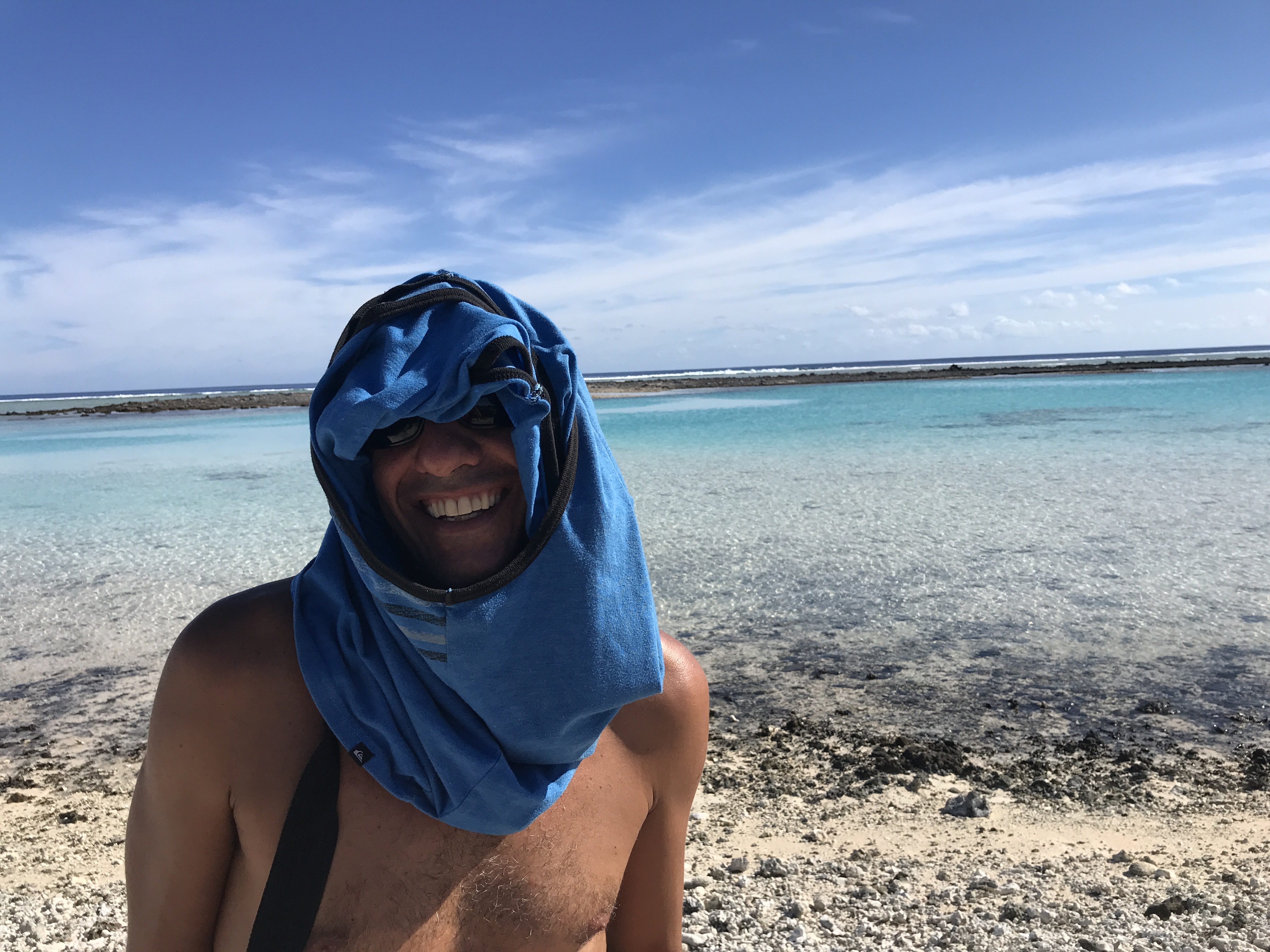 We walked around the edge of the outer reef, picking up shiny shells and ogling the arcing waves. A pack of local surfers crossed the shallows towards us, hoisting a huge boom box on their shoulders to keep it dry. They motioned for us to follow them through the bushes, back towards the surf spot. One of the older guys, lean and muscly with a scorpion tattoo on his chest and kind eyes walked barefoot over the razor sharp coral path. He started talking with Alex in French and offered me cookies as we sat down under a tree overlooking the waves.