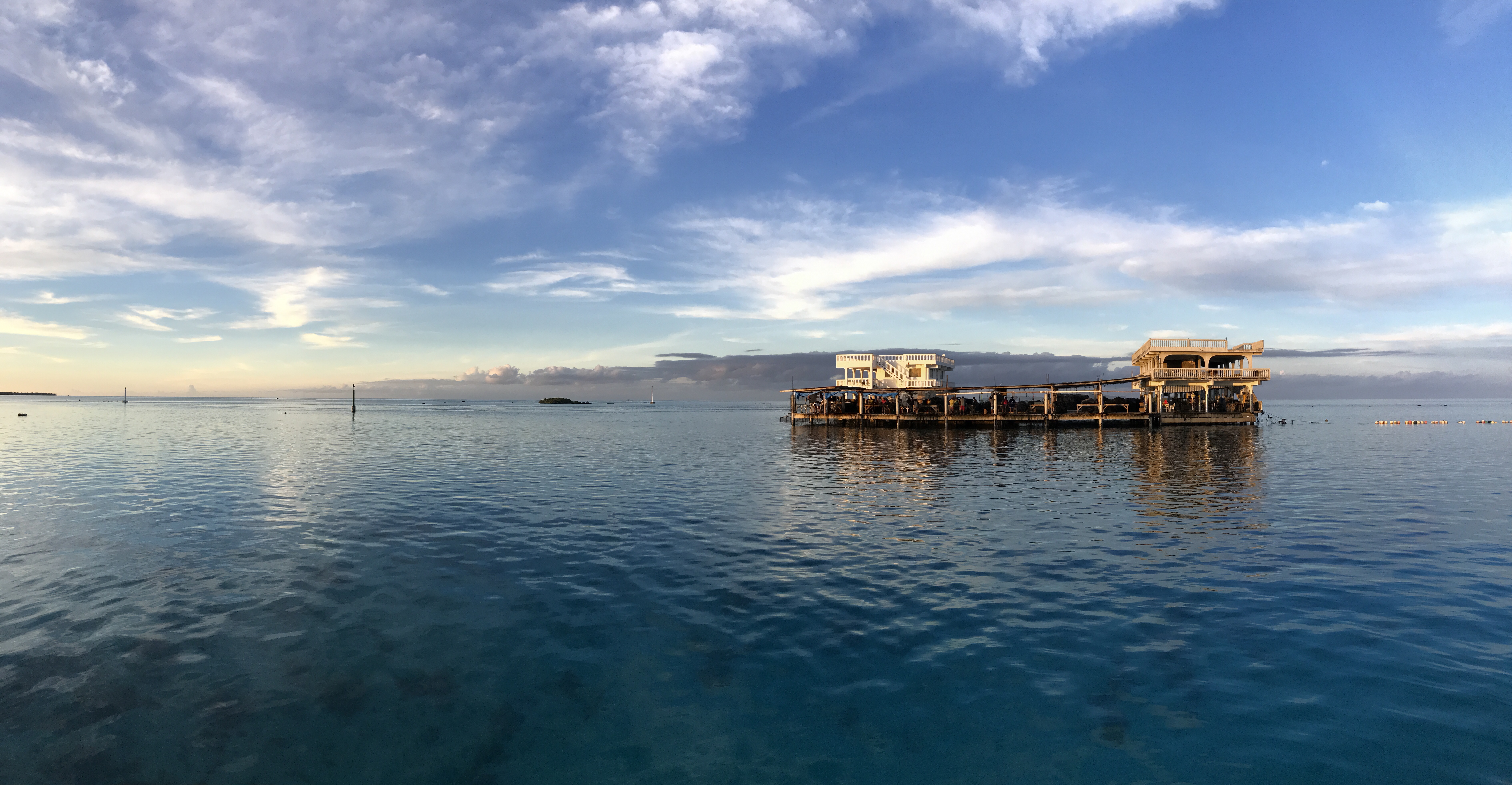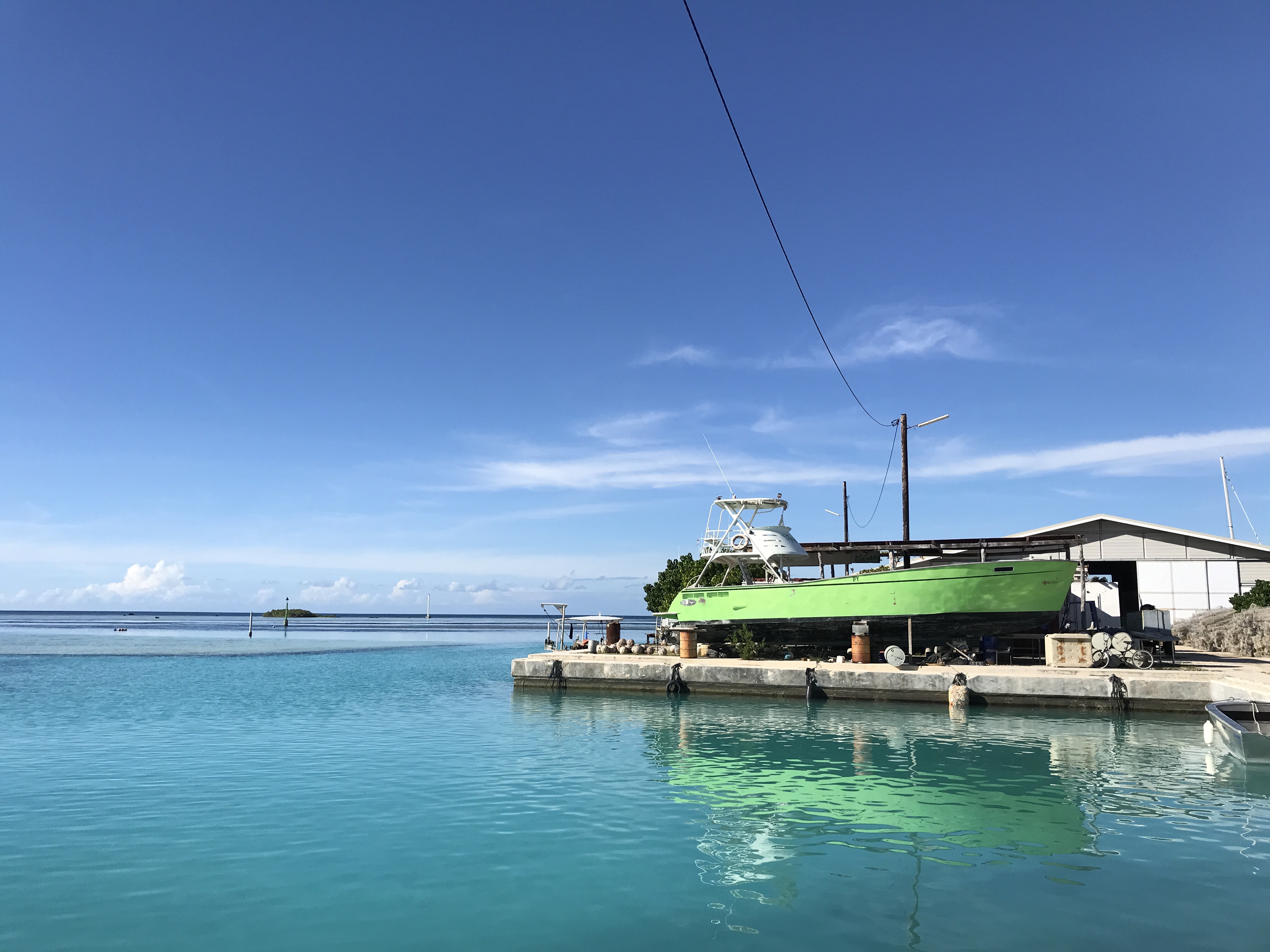 It was an unusual place to tie the boat. On the dock side our neighbor was a large warehouse full of power boats in various stages of construction. On our other side was a narrow shallow channel and a pearl farm building on stilts, surrounded by water, reef and fish traps. We watched the pearl farm workers heave nets full of oysters from the water around the building and slap the nets onto tables for processing. Managers crossed the channel in a muscly looking metal speedboat throughout the day, checking on the workers and bringing more oysters from outer farms. We waved, they offered chakas back, but in a way that we knew we weren’t supposed to be there.