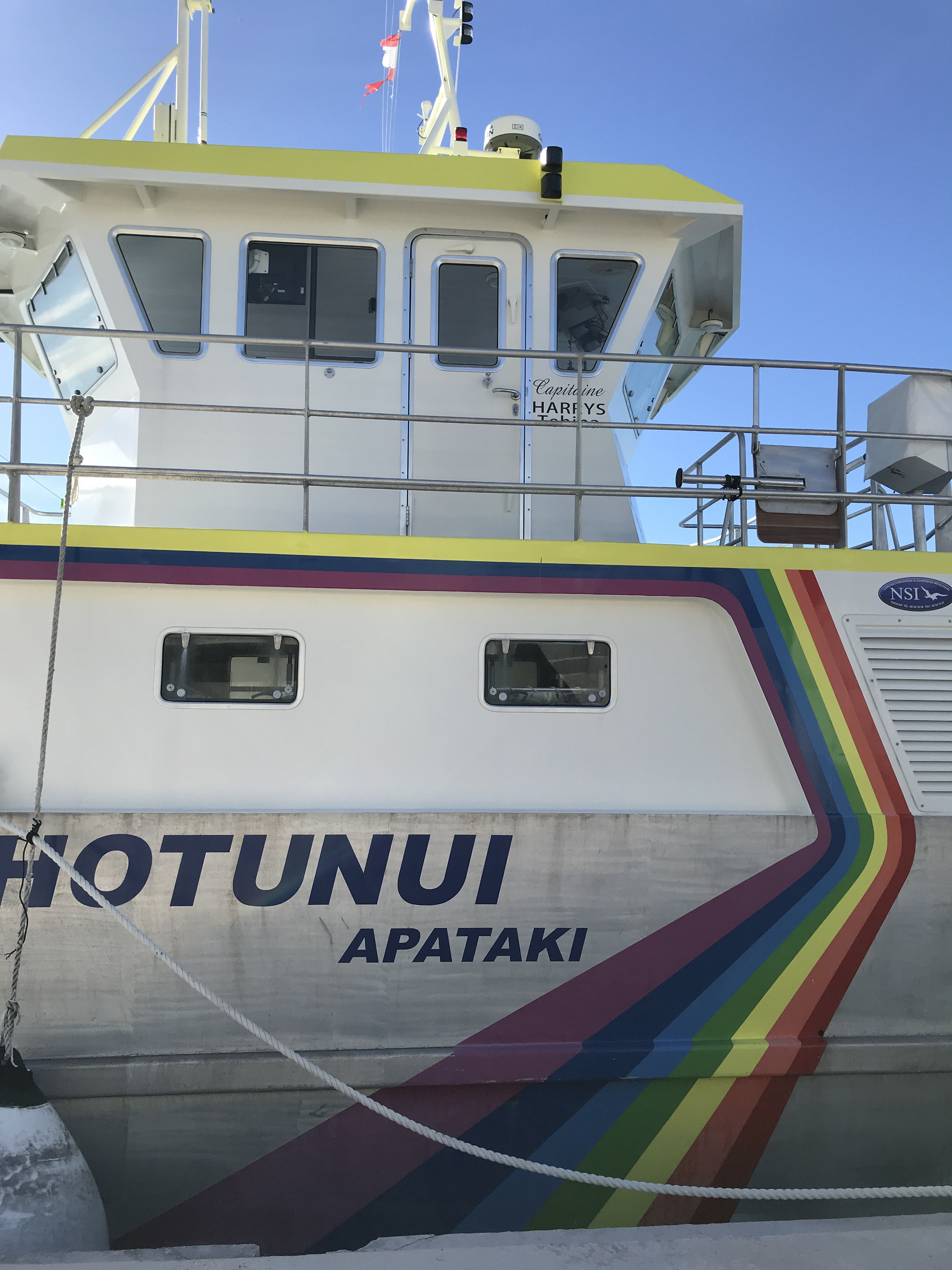 We sailed back to Niutahi and tried to anchor near the pearl farm. Our anchor got stuck in a coral head, Lucio had to dive to free it, and Teresia was dangerously close to shallow water. We headed back into the channel where the current was moving fast, full of whirlpools and standing waves. I spotted a space on a dock alongside a warehouse so we tucked into a side channel and warily watched the depth get shallower as we tied up next to the rainbow painted pearl transport ship.