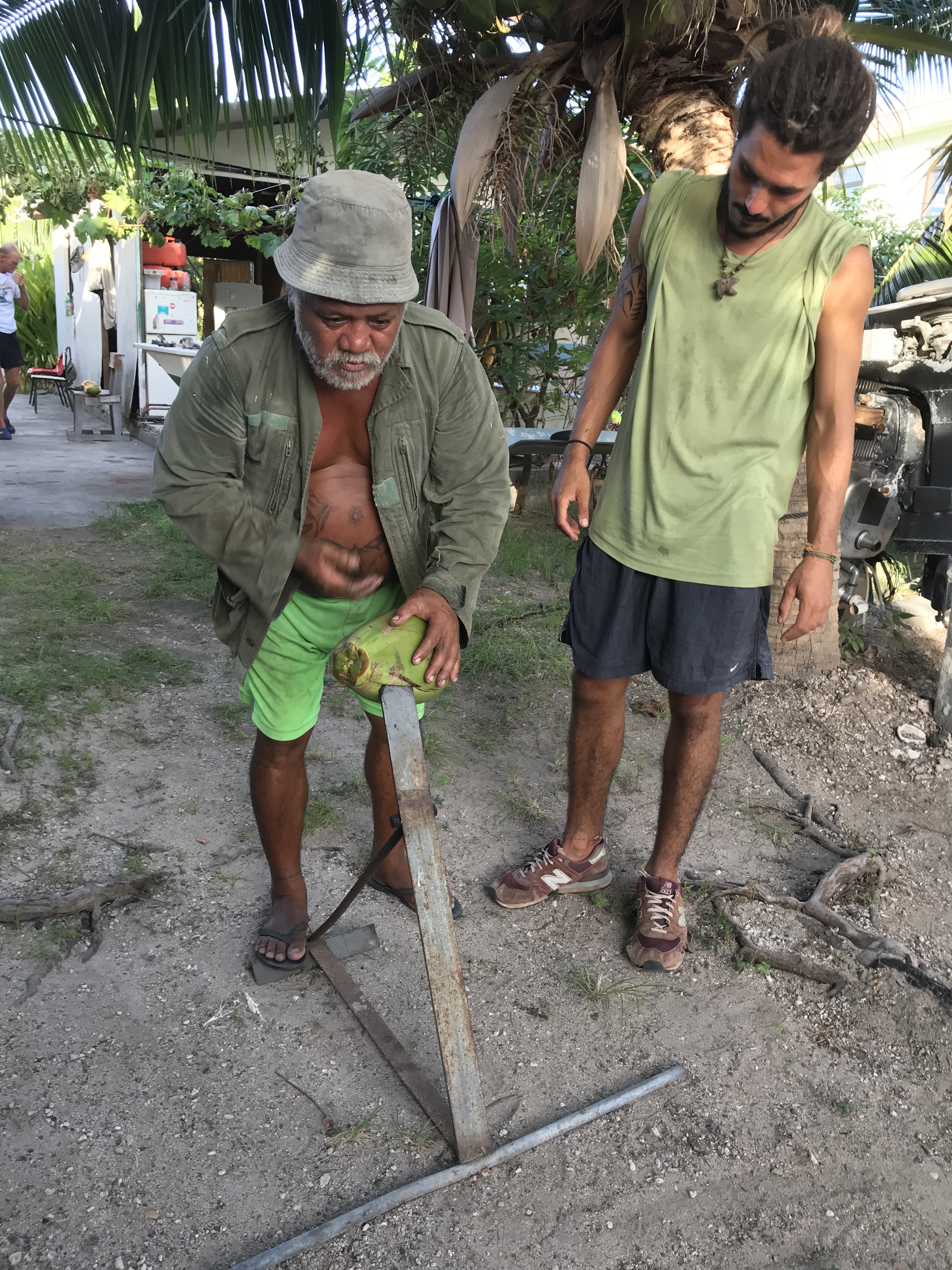 We sat together for a while chatting on the concrete steps. Nicolas brought out a small box full of imperfect black pearls and offered us each one as a gift. Then he taught us how to husk coconuts with a metal stake contraption. You slam the coconut husk onto the stake and rotate the nut slightly to peel off segments of husk. “Don’t lean into it, the stake can pierce your heart,” warned Nicolas somberly, as if he’d lost loved ones that way.