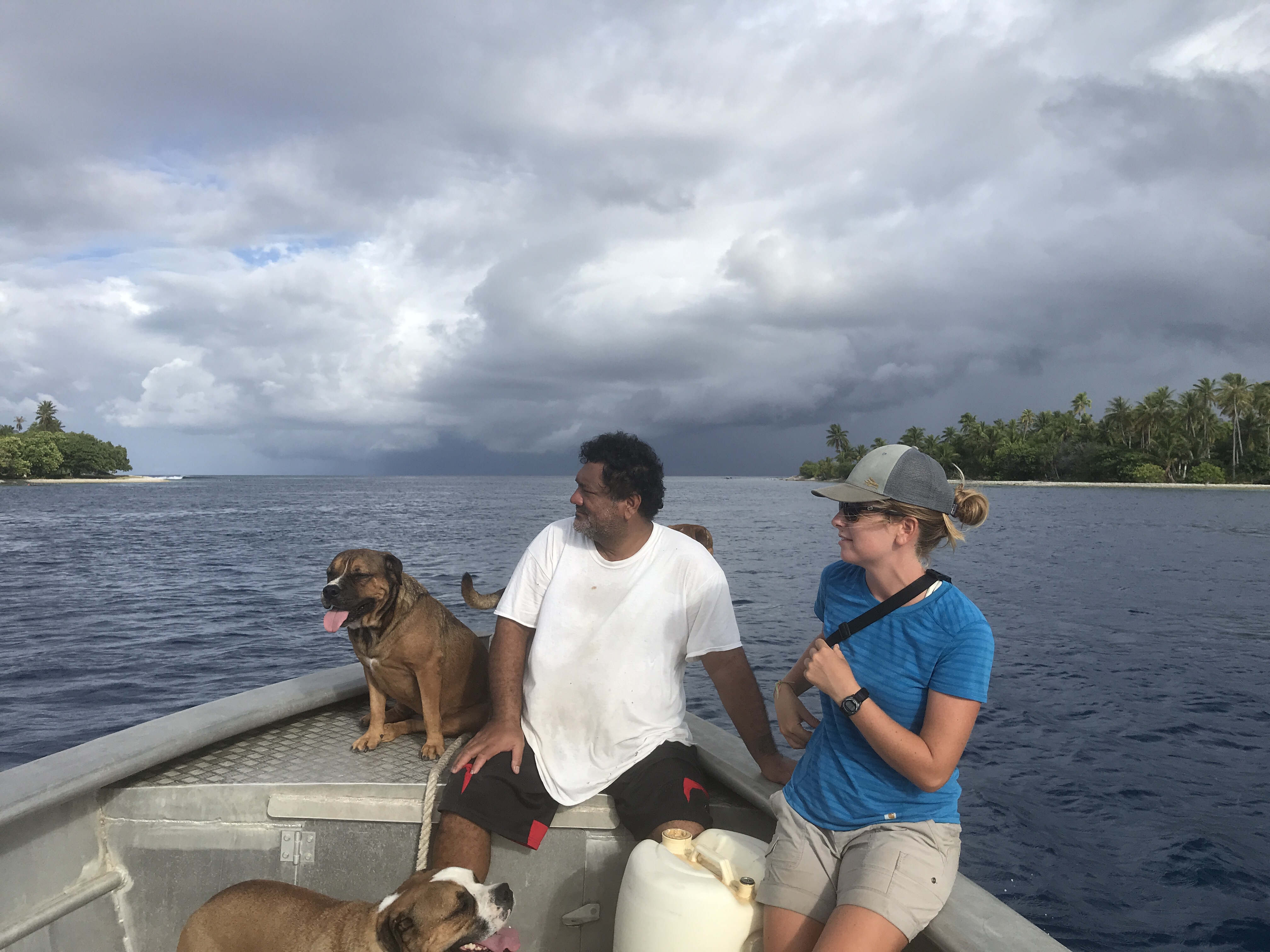 Ernest put on gruff airs at first when his new recruits climbed into his sturdy, 20 foot long metal boat. He motioned for Alex to move a plastic drum, half full of gasoline to the other side of the boat, but without saying any words, so it took Alex a while to figure out the command. Six dogs piled in, then the Italian steered us out the pass into the open ocean.