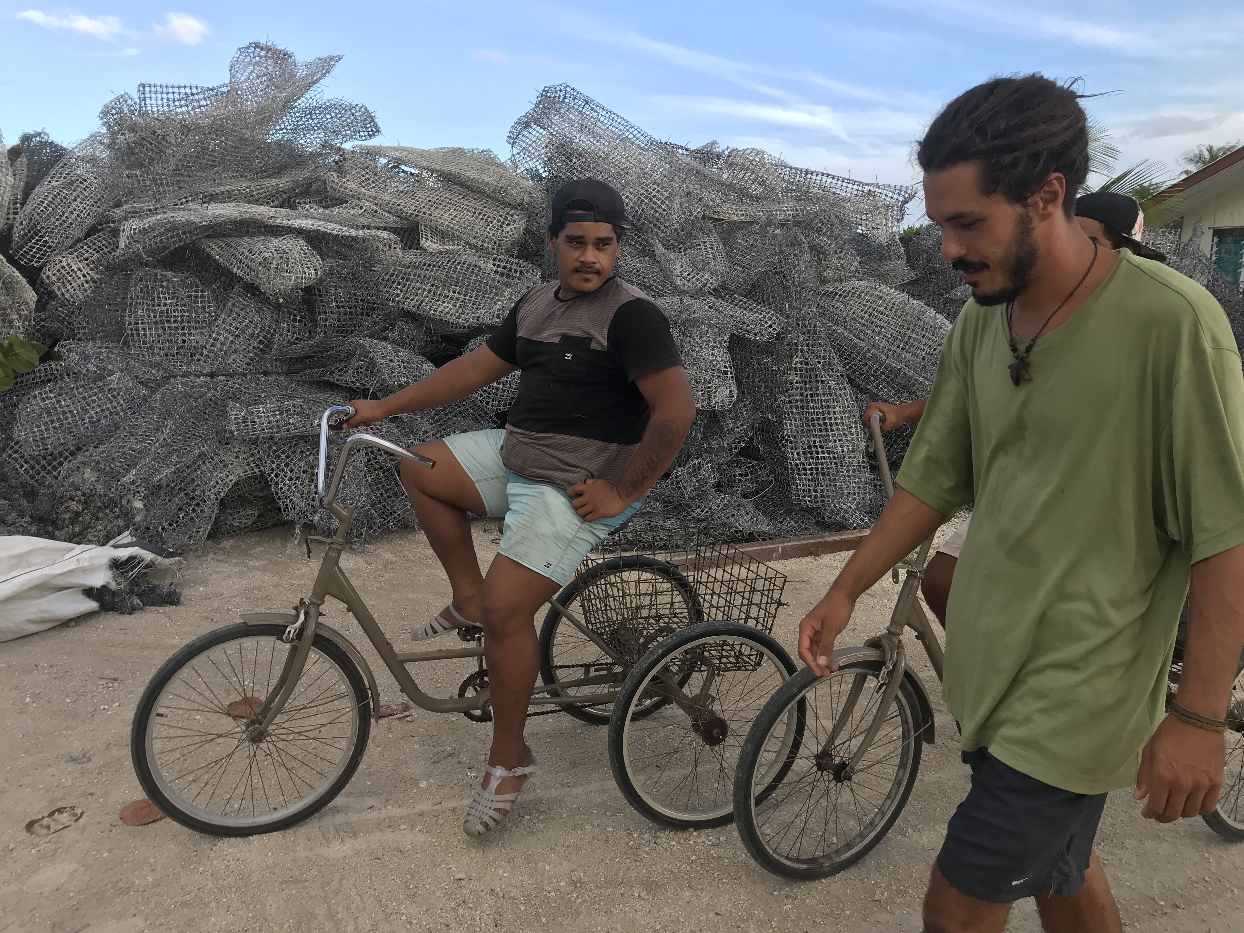We ambled through grassy alleyways, overhung with breadfruit and plumeria trees, then past organized piles of pearl farming materials: plastic colorful globe buoys, black nets, stacked bags of mature dried shells.