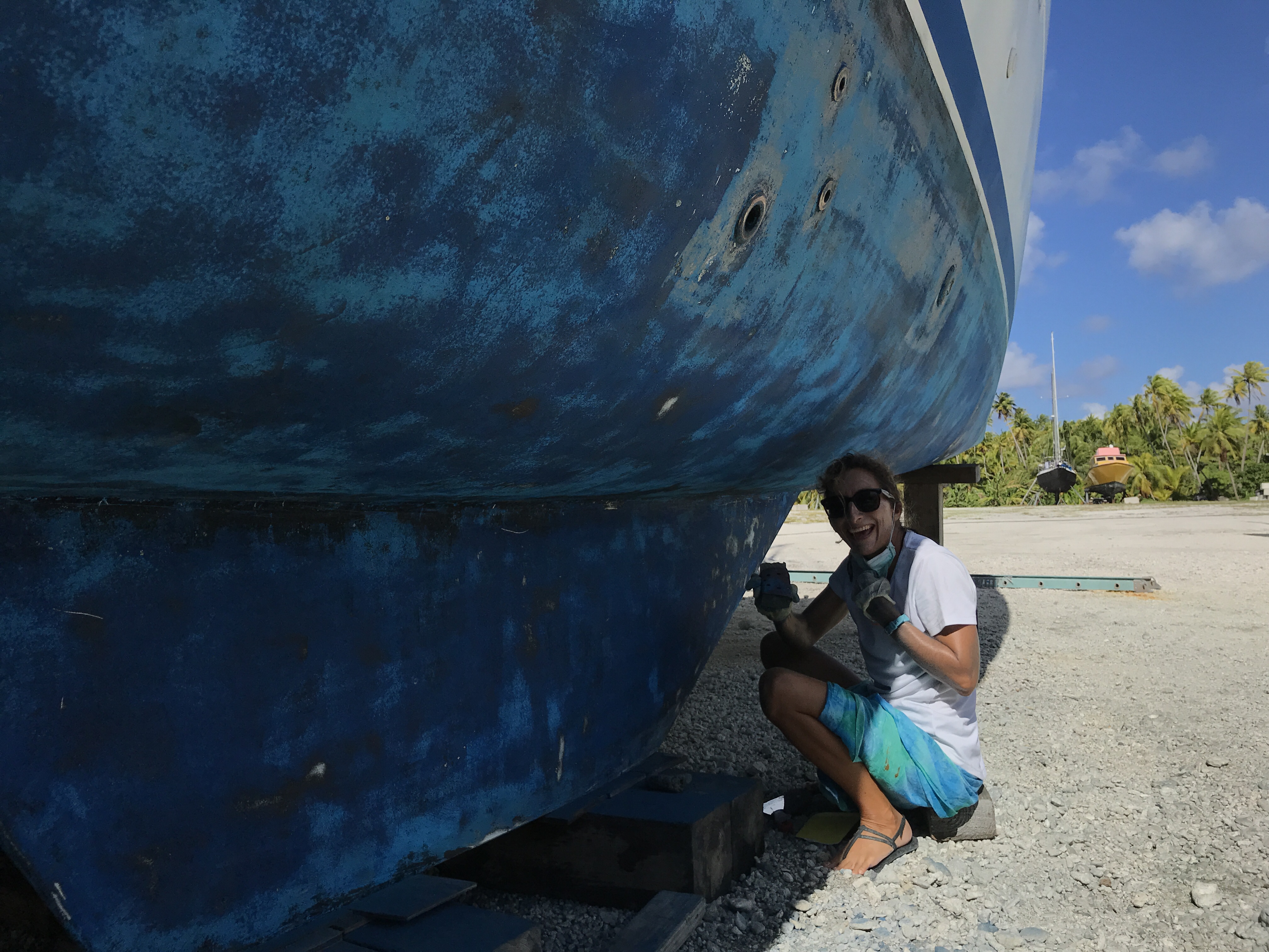 The rainbow boat felt like a music box without her ballerinas. We’d just returned to the Carenage shipyard after dropping off the boat’s owners and crew, the four French doctors, at the Arutua airport. So now I was captain of this ship. I climbed up the 12 foot tall ladder to my new home, a rainbow painted black steel sailboat resting on stilts in a remote atoll in the middle of the Pacific Ocean.