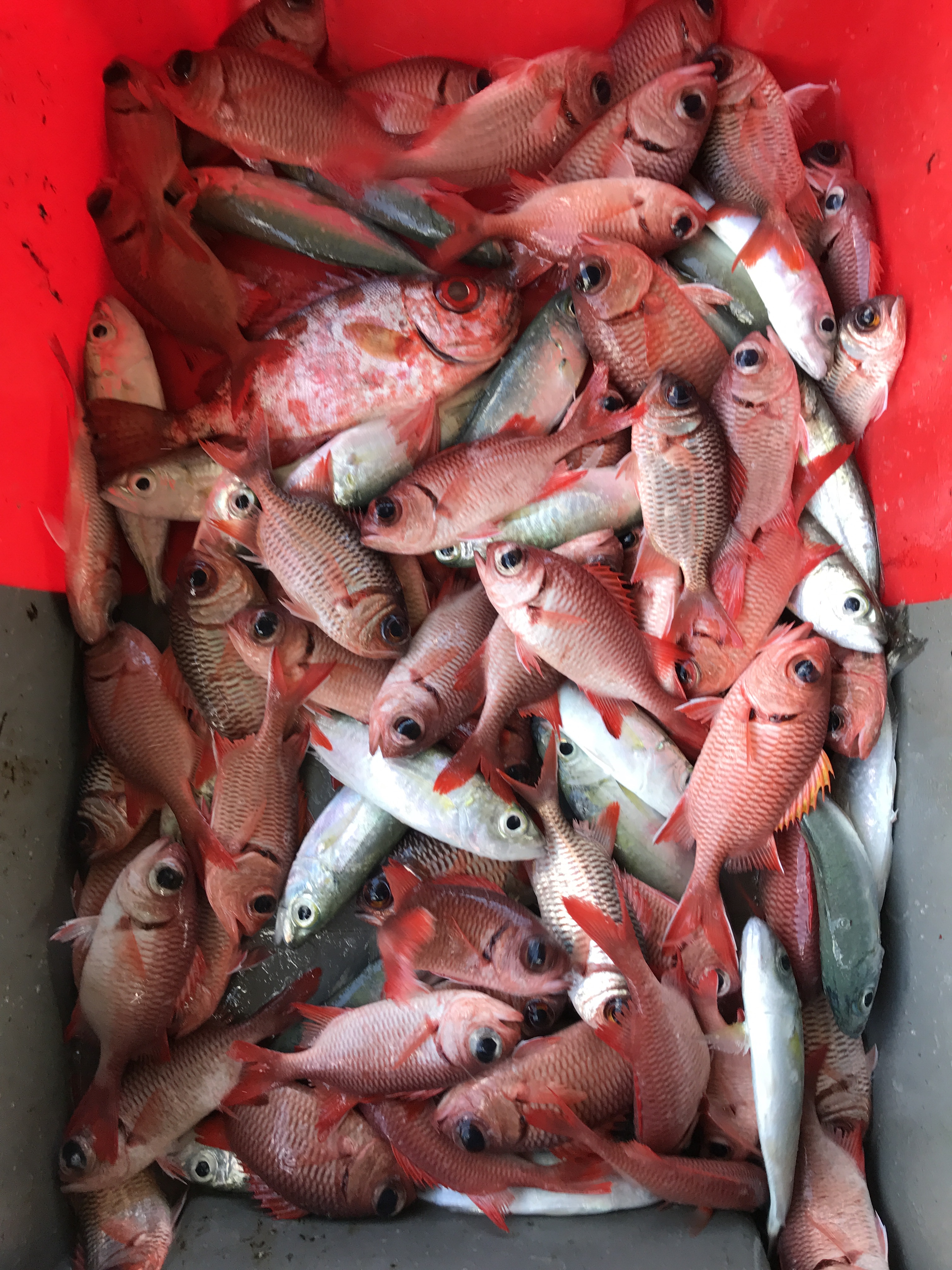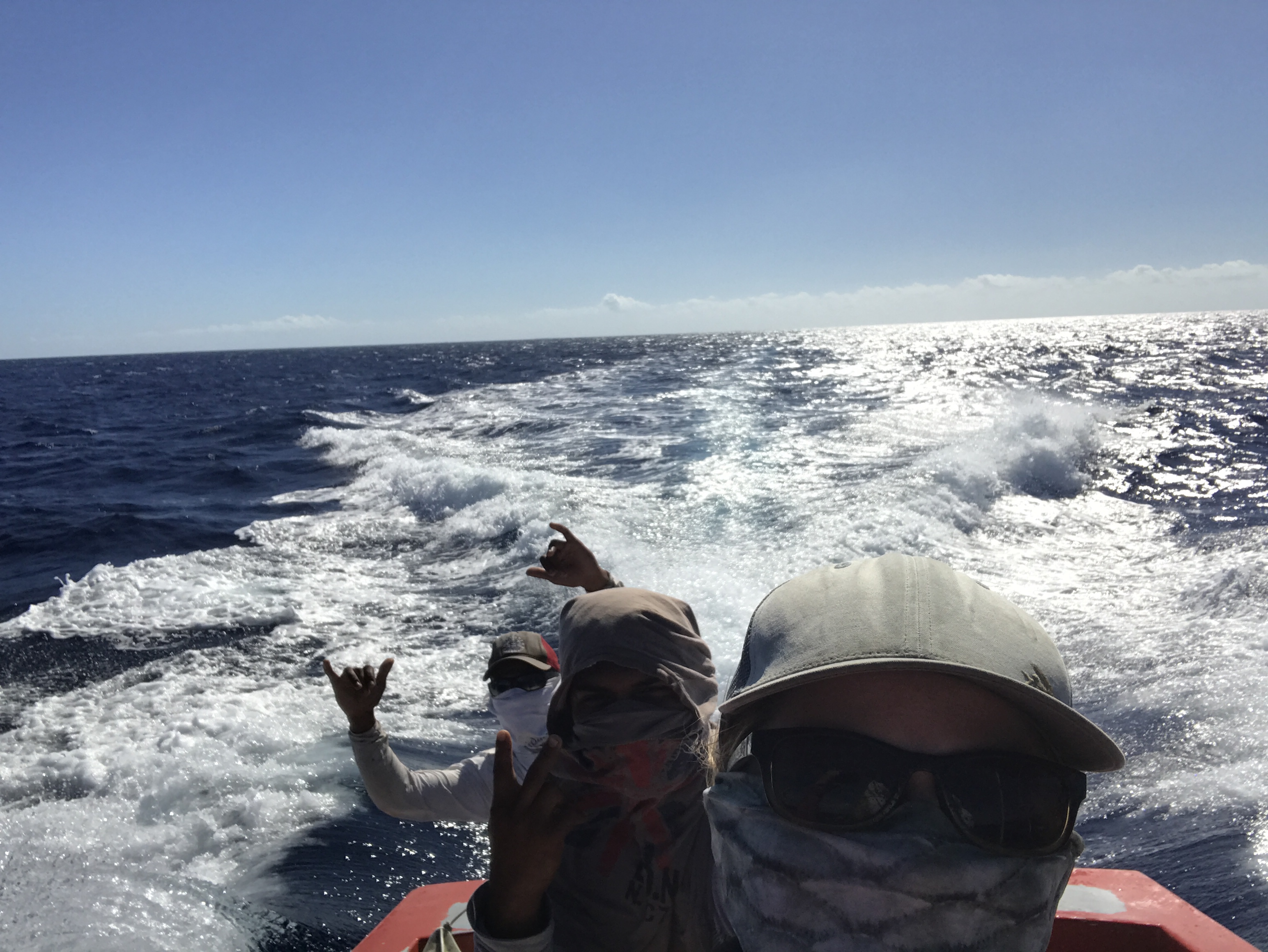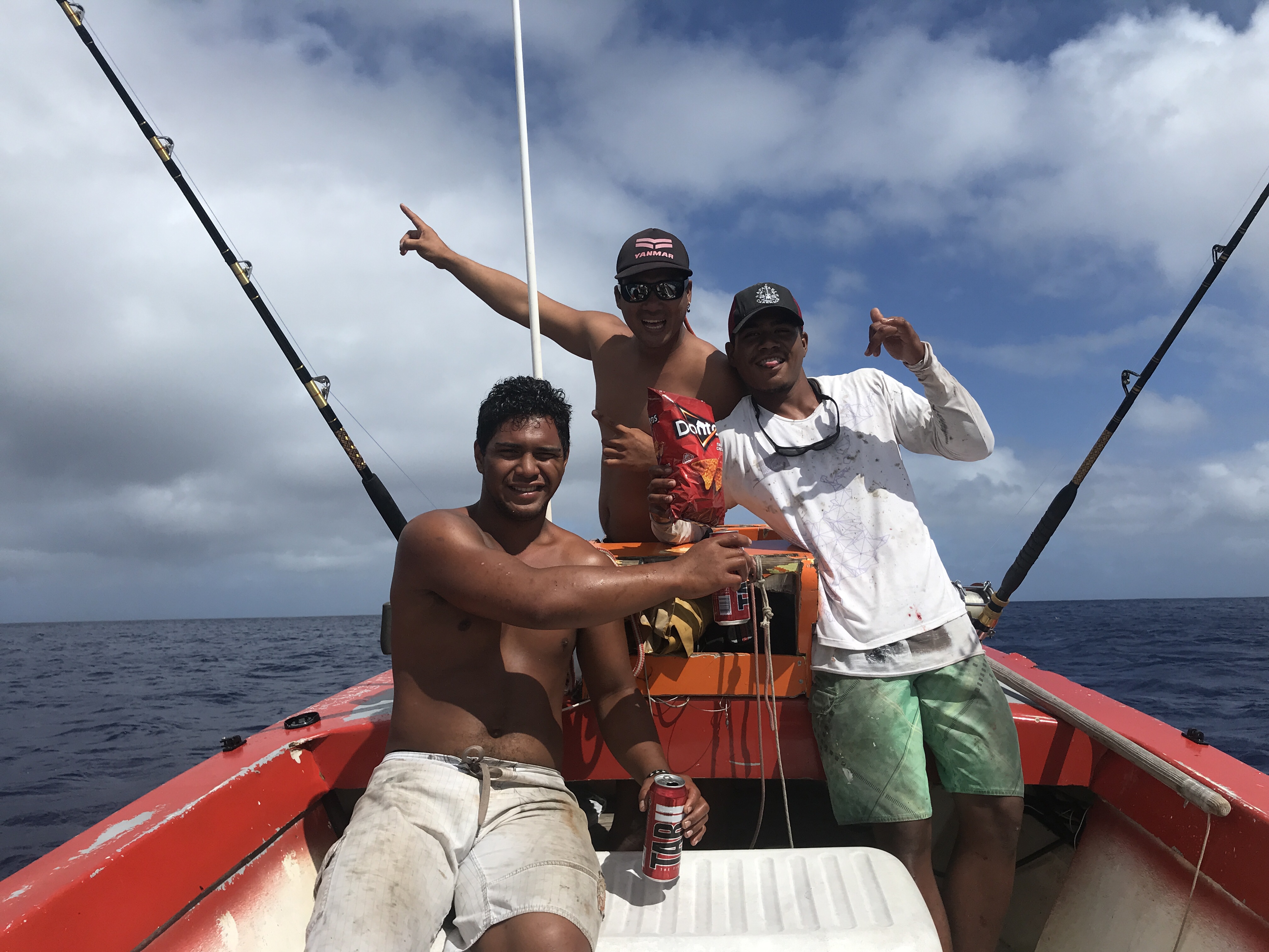 Tony, Tahai and I went out fishing to try and catch the guest’s favorite fish—wahoo. By this time, the guys were comfortable being themselves around me, drinking Tabu (canned beer and flavored vodka) in the boat, sharing their coconut sandwich cookies and beloved Doritos (more delicious than fresh fish they raved). They looked out for me like brothers and touched my shoulder gently to bring my attention to something dangerous—waves, eye-level hooks, fillet knives underfoot, giant moving ice chests. It was a bright mixed sunny and squally weekend day so the guys let loose and enjoyed the adventure, they were off the clock.