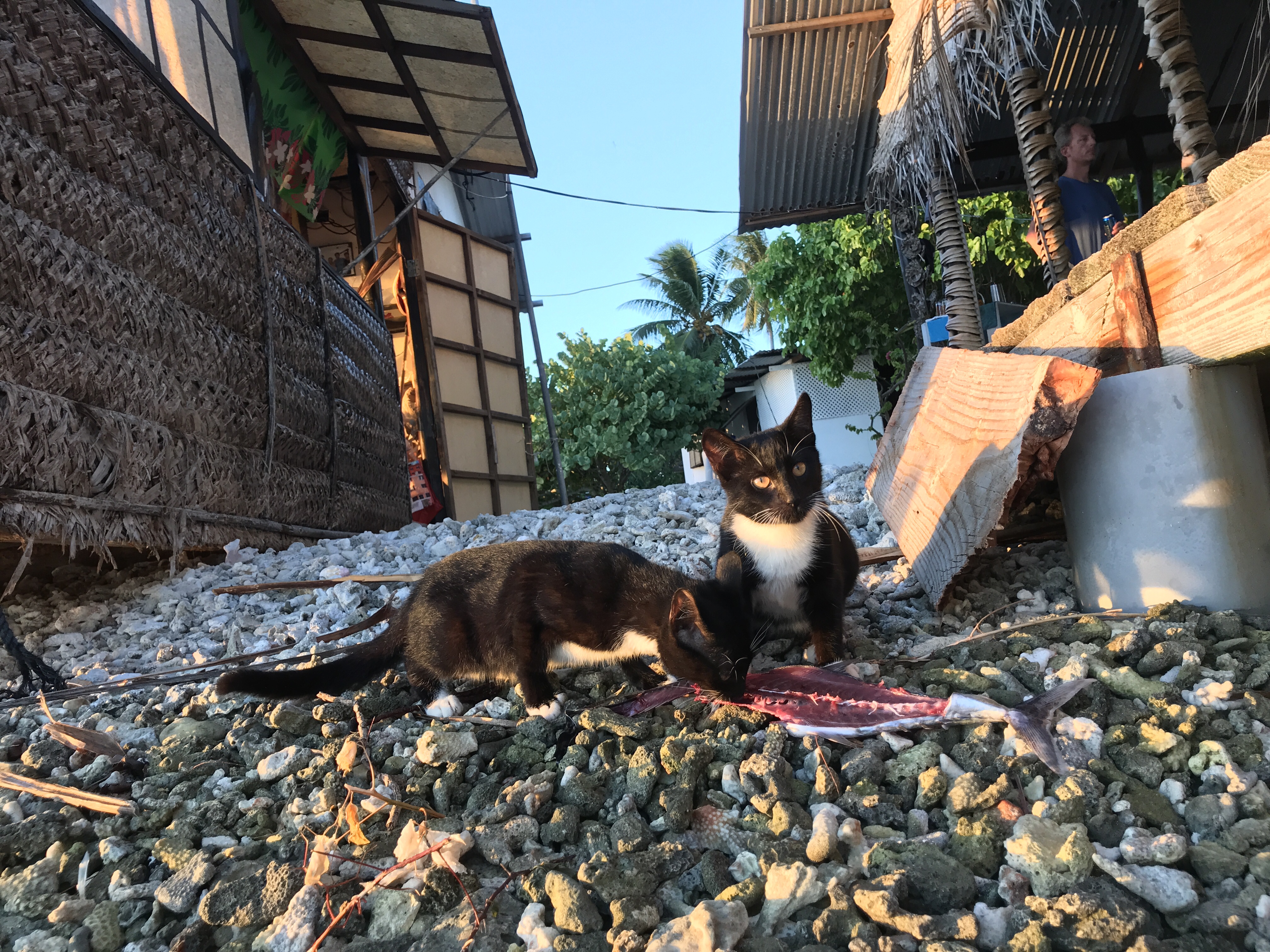 Tahai and Tamatoa set about to prepare the bonito on the deck joined to the outdoor kitchen. Tahai tied the fish tail to a cord and wrapped it around a beam so the fish hung at his eye level. He ran a knife down the spine and freed the two side fillets for Tony to turn into sashimi. Tony methodically sliced even pieces from the fresh flesh—the setting sun shone through the meat making it glow like rosy roasted beets. He gave the scraps to two cute black kittens hiding under the dining room near the beach.