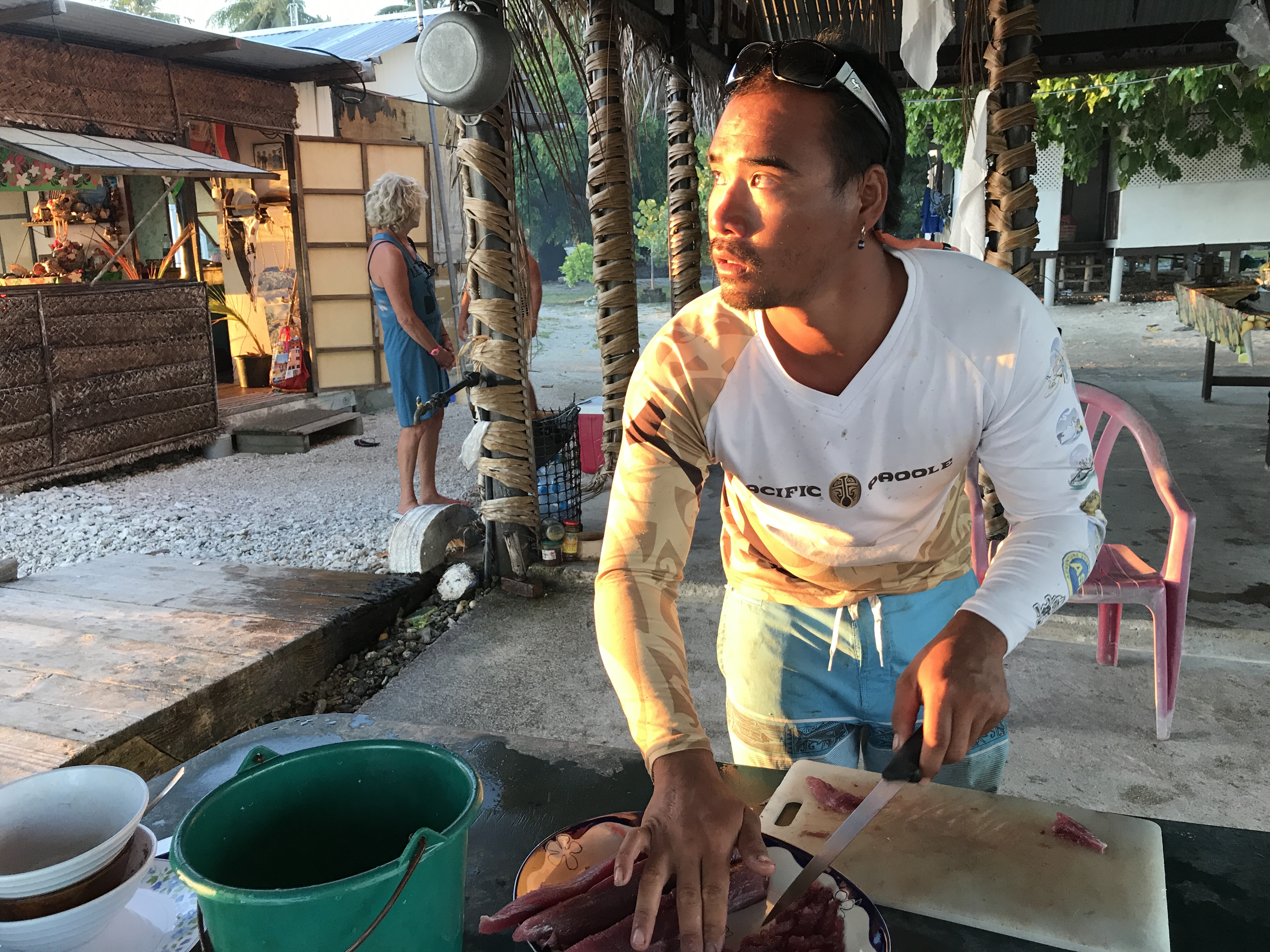 Valentine gave Tony a bear hug. She is always put together, with a short pareo wrapped around her joyful belly and tight bright colored tank top, a substantial necklace worn proudly over her light yet toasty tanned skin. Her wavy light brown hair streaked with grey was wound into a claw clip, adorned with fresh picked tiare flowers. She laughs throatily throughout the day and into the night, her broad smile full of worn teeth. Valentine’s face is quick to change from content and sparkly to stormy and drawn, shifting like the passing squalls over the atoll. She stands her ground with thick strong hairy legs and her solid arms give her a gravity, in contrast to Gaston’s lithe and sinewy floating nature. He wears a large glossy shark tooth on a leather cord around his neck, elegantly flanked by carved beads. His light-skinned face reminds me of a meerkat—alert, mischievous, with a pointed chin and round shiny eyes. He is sweet, happy, energetic and always watchful to do as Valentine needs. I only saw him wear a shirt once when tourist sailboat cruisers came to dinner. Otherwise his strong, tan torso was always in the fresh breeze.