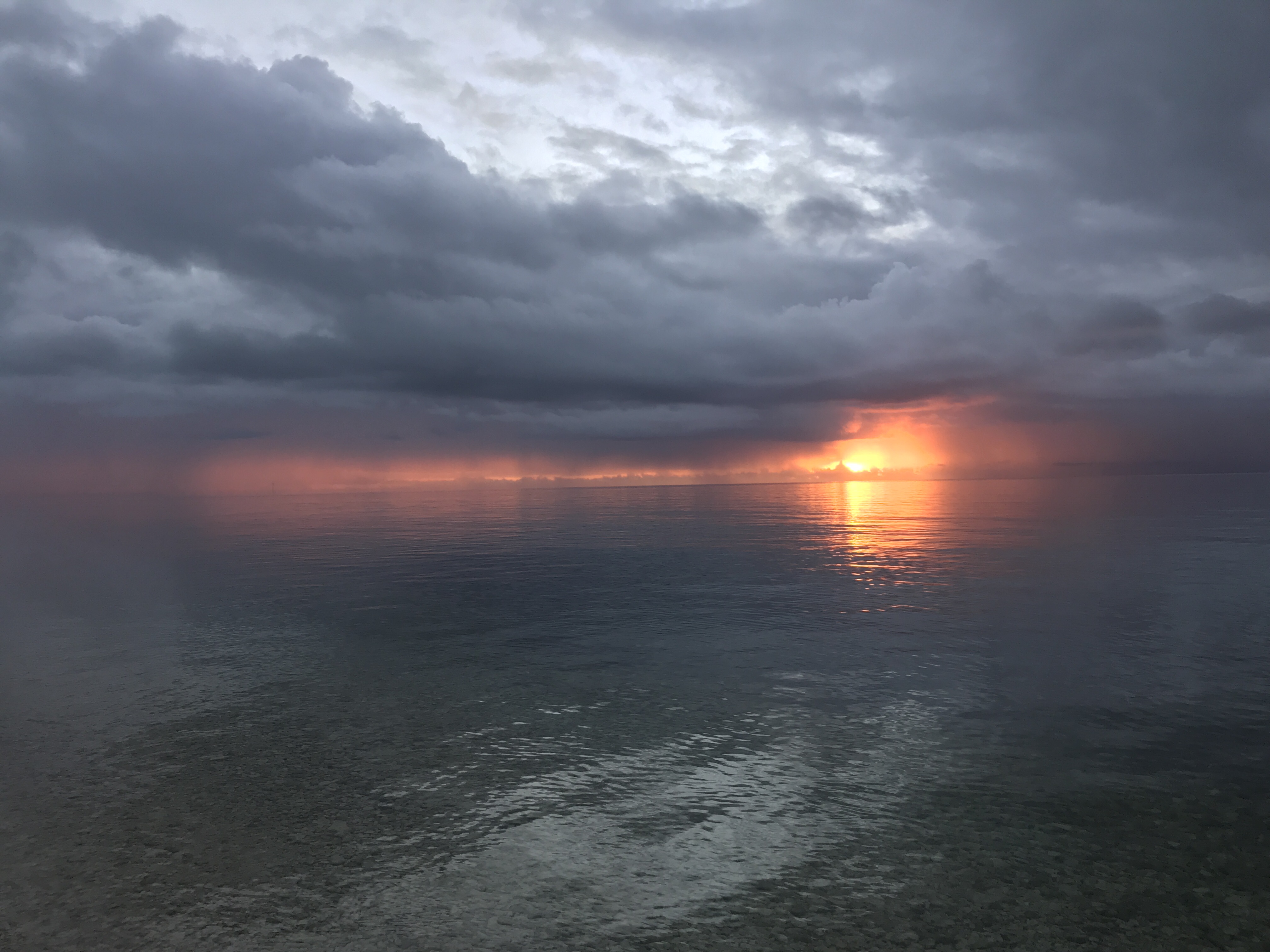 One evening the storms eased and I strolled along the coral sand beach at sunset. It is a classic pristine tropical beach, the kind you see on postcards, undulating beyond you with semi horizontal coconut palms reaching out into your path, inviting you to play on them like a balancing beam. It was low tide, so I walked out onto a broad sand spit, ankle deep in periwinkle grey mauve water. A small black tip reef shark caught me by surprise as she wove through the shallows, hunting for dinner. It was surreal to see her, her velvet grey skin caught between pearlescent sea and skies, all blended into eachother along with the storm clouds.