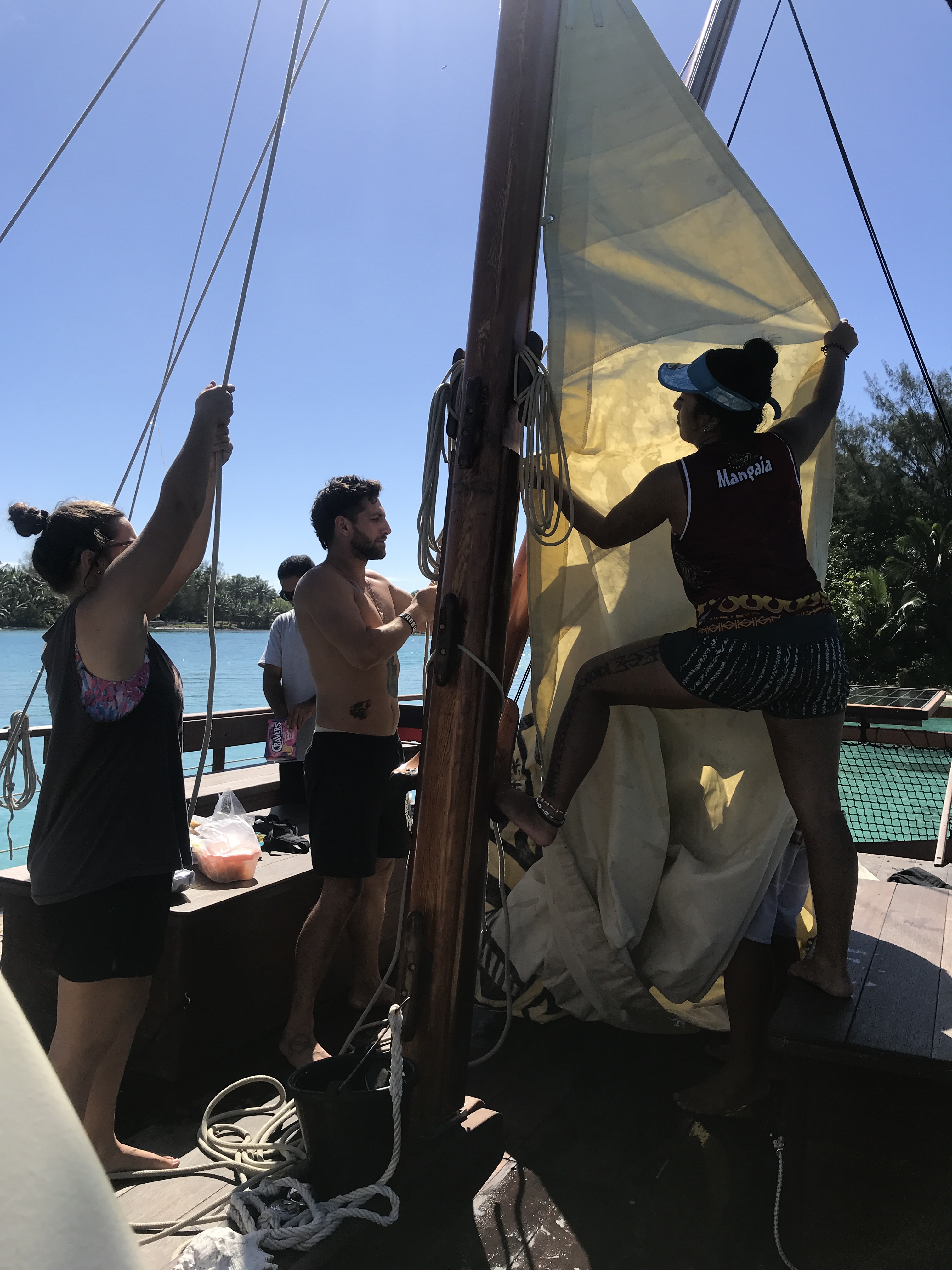 An arsonist set fire to this beautiful vaka in 2017 while she was docked in Rarotonga’s main town. The Cook Islands Voyaging Society rallied together and secured a quarter of a million dollar donation from the Cook Islands government and a donation from the shipping company Matson to ship the boat to New Zealand for a complete restoration. Only a few months ago, she sailed back to Rarotonga. So it was a huge honor to be invited to sail with the crew who’d just switched from fundraising and rebuilding mode to sailing her again.