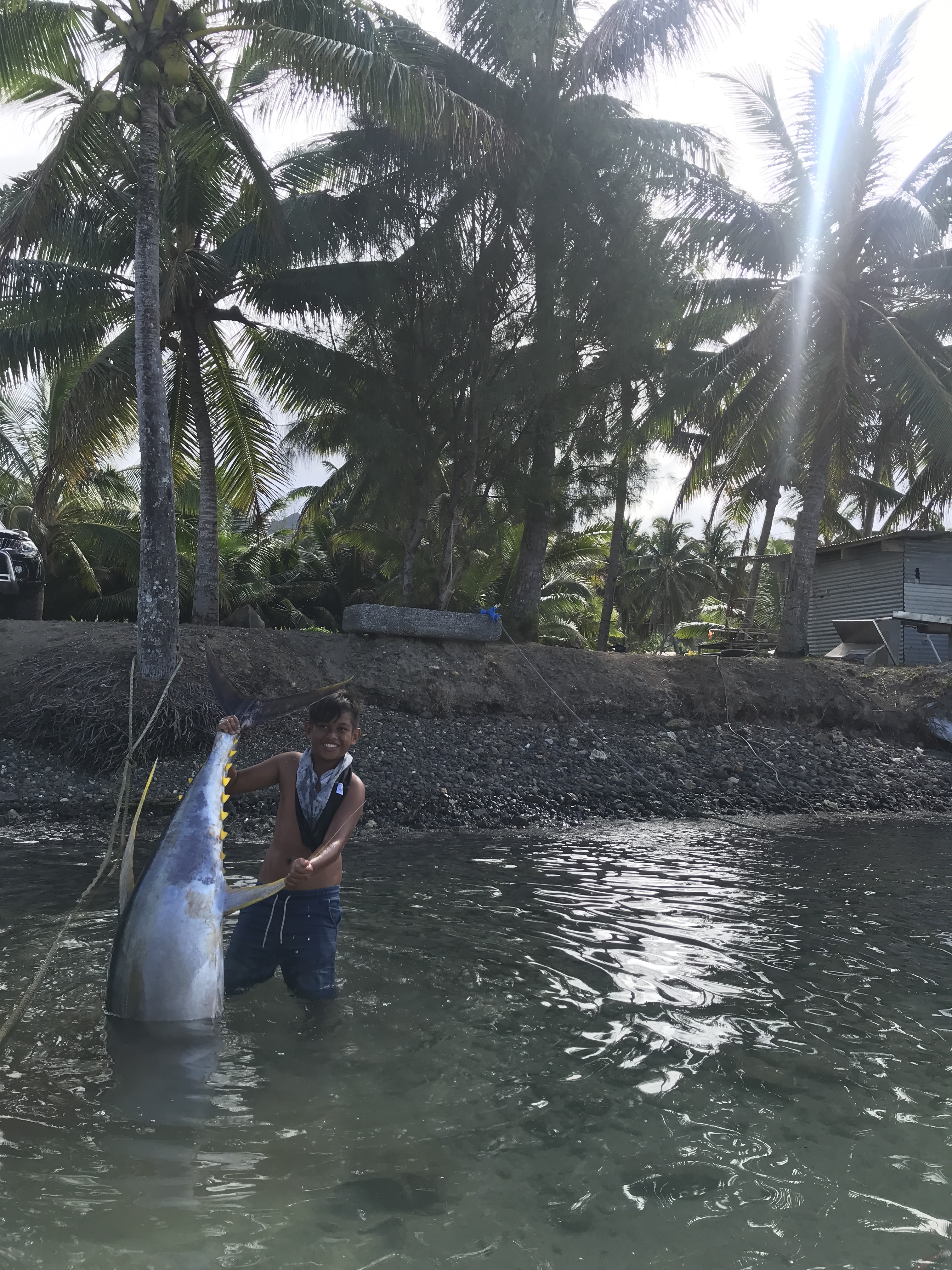 Alfred cut up bonito they’d caught yesterday for a sashimi snack. It was silky and perfect, he explained if you rest the fish, whole, for a day it lets the muscle fibers relax. We came through a flock of seabirds and the lines started zinging. Tupalea hollered at me to get on a line and I started reeling in my fish. It was difficult! I hadn’t reeled in a fish in forever. And when I saw how small it was, maybe an arm’s length sized bonito, I laughed. I had much more appreciation for how hard Alfred had worked to bring in his giant.