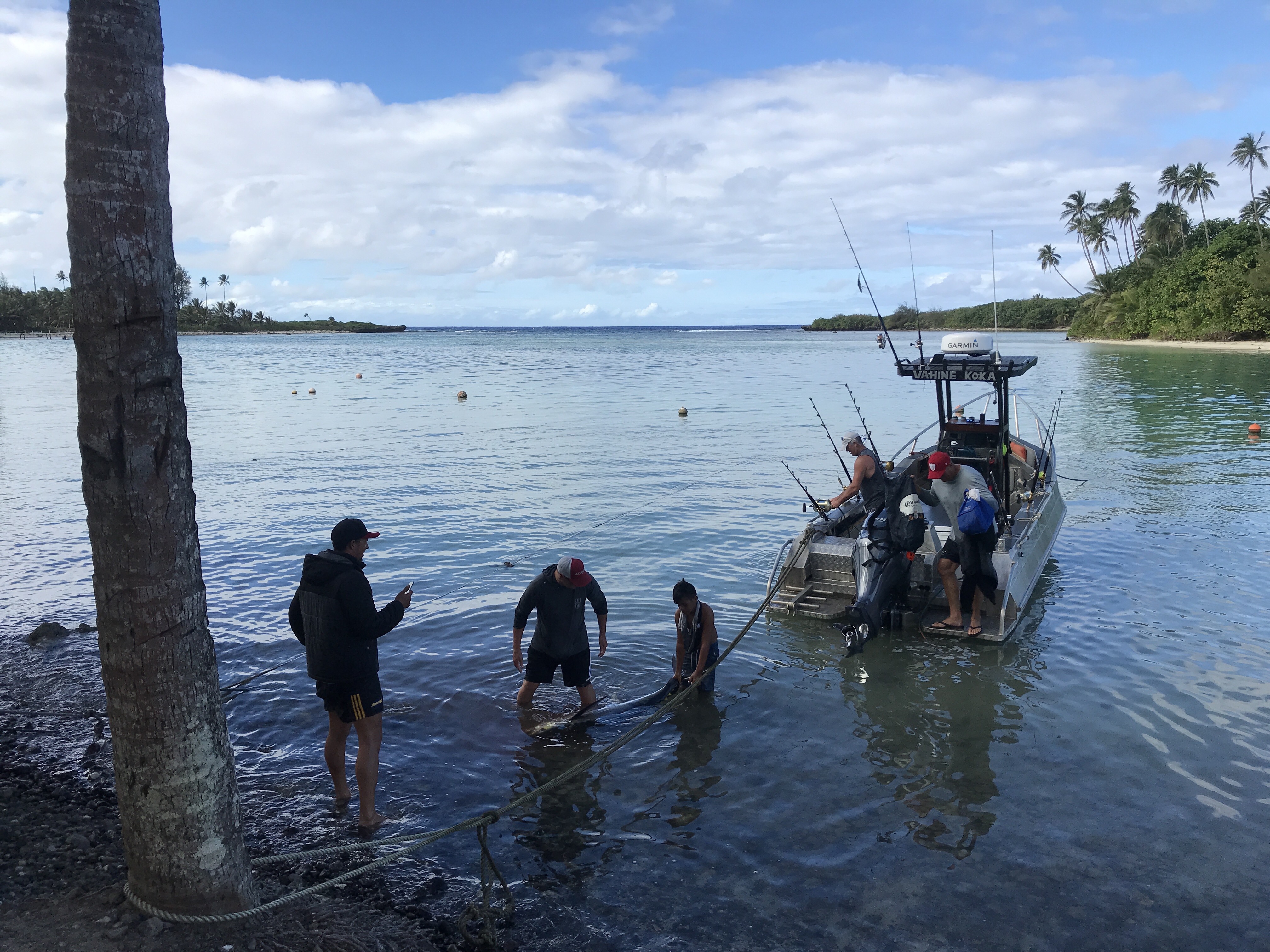 Sam invited me to join the weekly crew training day, so I sat on the fancy wood dock in the lagoon to wait for my ride out to Marumaru Atua. The dock displayed a small shiny plaque indicating that it was a gift from the government of Japan. Japan fills local government coffers and plies that influence to, among other things, secure fishing rights in Cook Islands waters. Their industrial fishing operations have already depleted stocks in the region, local fishermen explained to me as they set off from the dock. They invited me to fish with them the next morning.