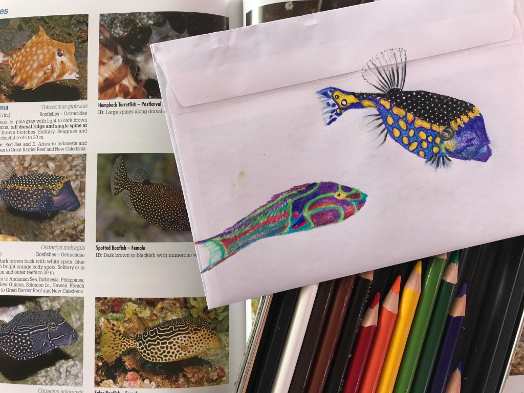 When he left again I felt overwhelmed with aloneness and felt guilty for feeling sad in one of the most beautiful places I’ve ever seen. At that moment, a rainbow colored cuttlefish came swimming towards me. A glossy black eye looked at me with a direct expression as if to say “Well, I’ll swim with you, I’ll be your friend.” My heart jumped with joy. It’s translucent flesh flashed and shimmered with LED-like rainbow colored spots of all sizes, clustered together in spray paint pixels. It’s torpedo shaped body, as long as my forearm, sleek and fat, with streamlined diamond shaped fins waving at the tip of its torso and it’s stubby tentacles working away on the other end. The universe sent me this special, rare, gorgeous messenger to give me the strength and presence of mind I longed for. I swam after the sweet cuttlefish, along the reef face, after an entrancing while it speed off into the deep.