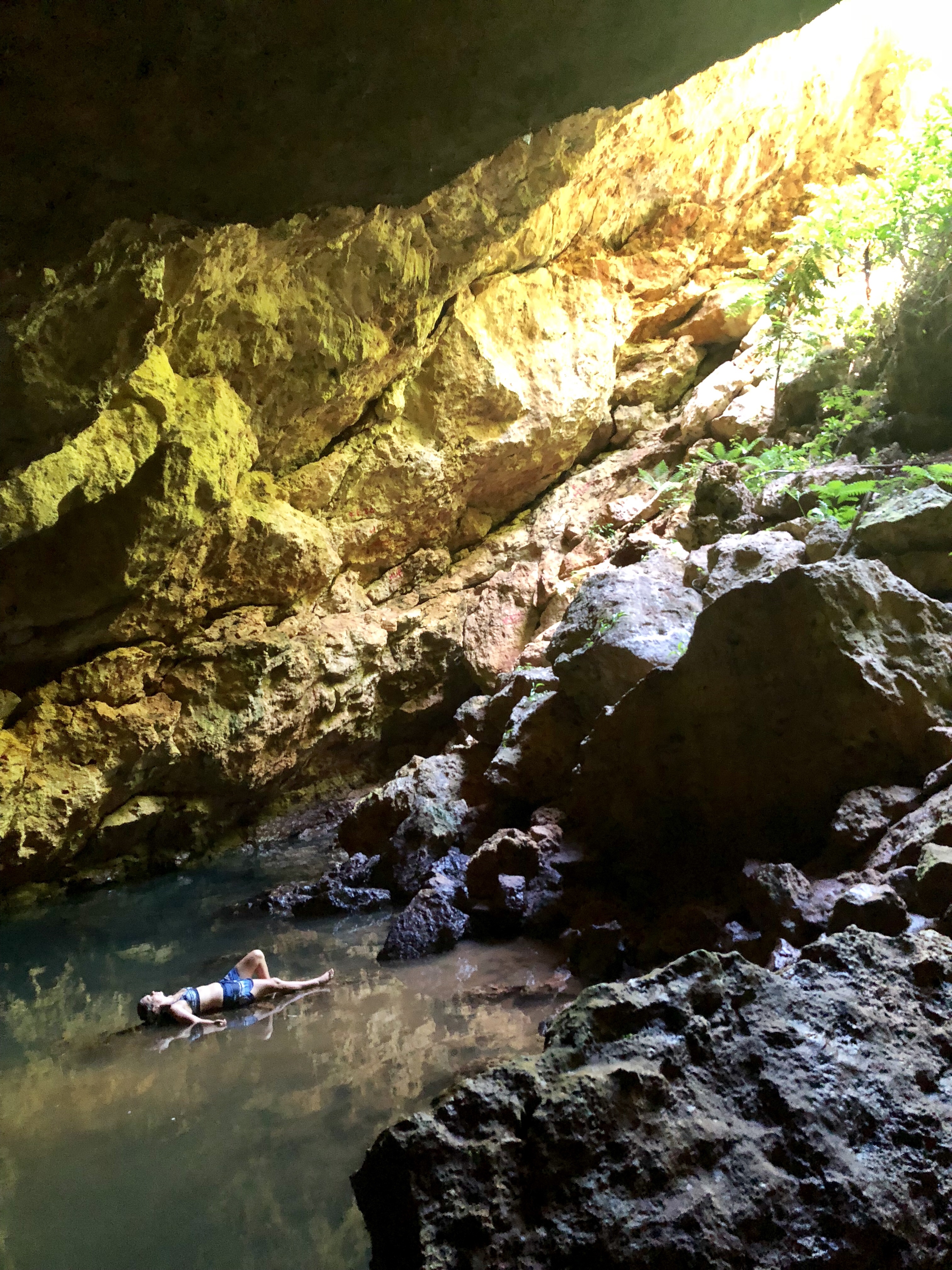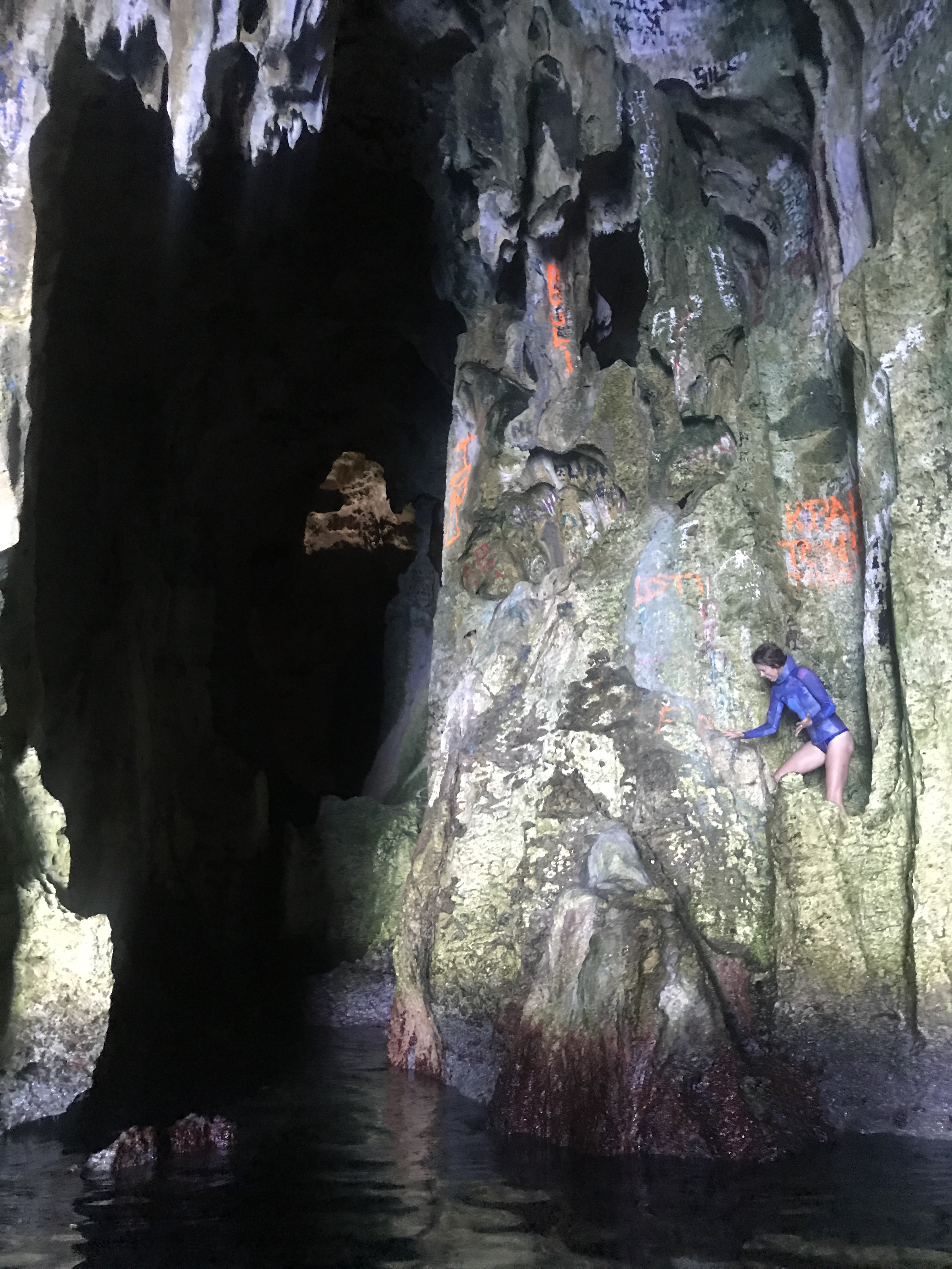 We used google maps to find the spot, which felt like cheating since we never have cell service in the open ocean. But Eric had been using the satellite image function on google maps to navigate the dinghy through reefs with surprising success. I dove down to look at the cave entrance, the others went into it and swam through it to come up into a cavern. I wasn’t confident I could equalize my ears or hold my breath for the required time, so stayed back happily to keep the dinghies near the cave. One day I’ll be able to free dive.