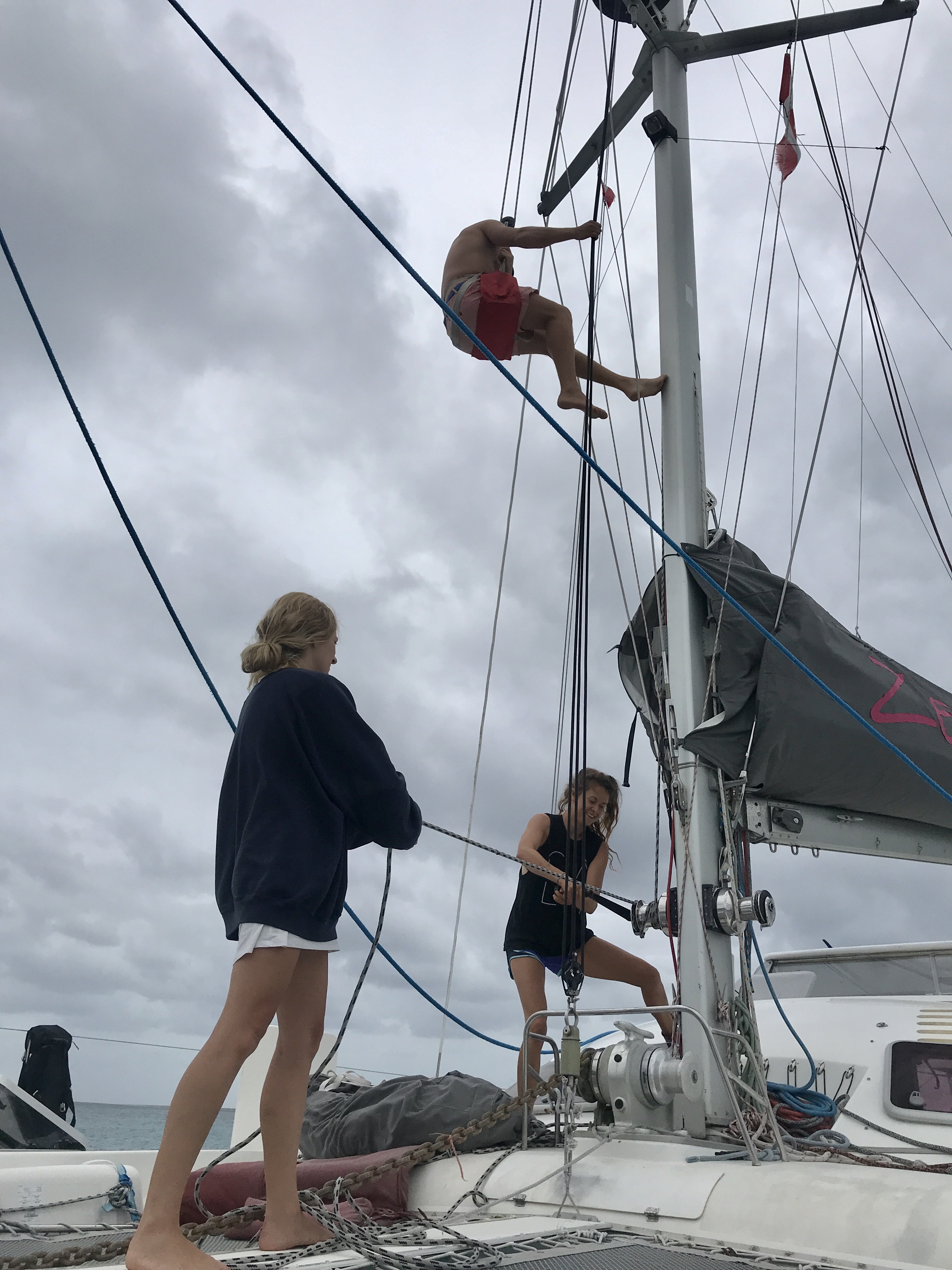 Lauren and Abby hauled Eric up the mast to check for any potential issues with the rigging, all was well, he reported. We checked the weather every day to see when we should leave Tonga for Minerva Reef 348 nautical miles away.