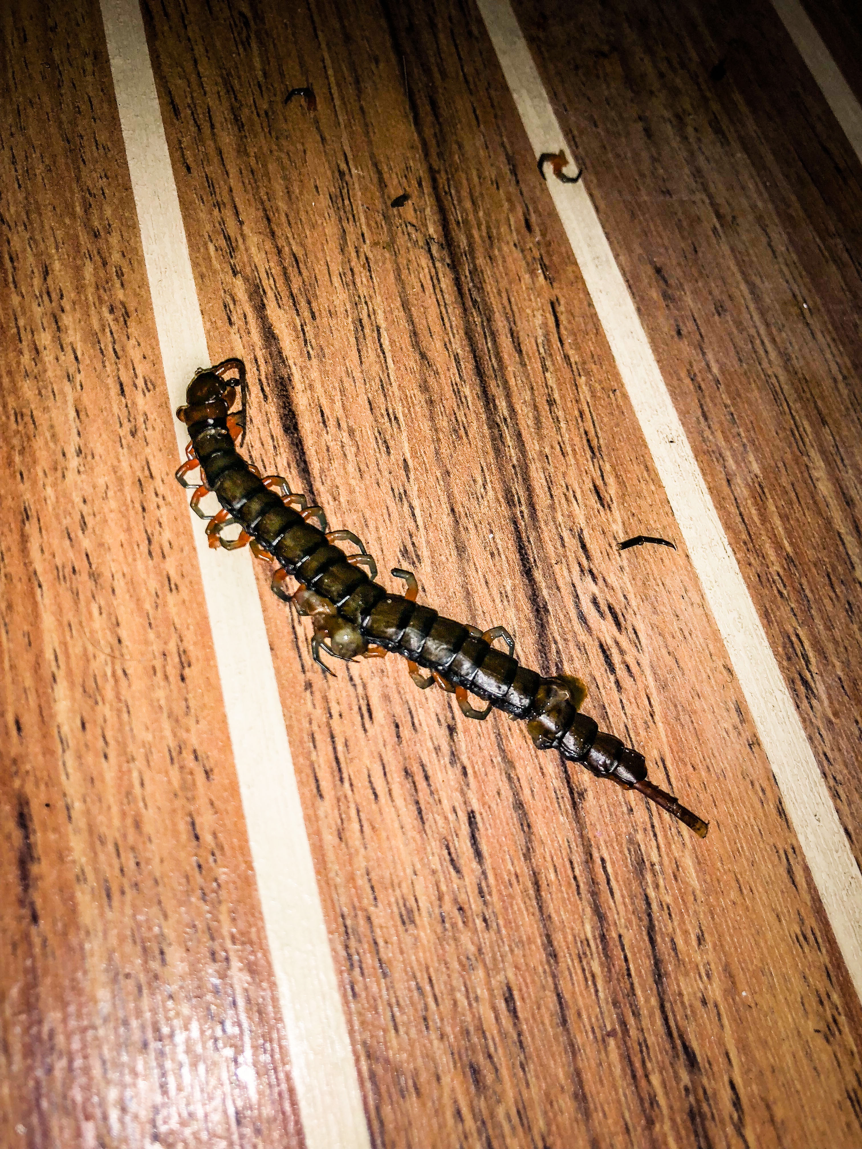 Ted, the venomous centipede, who’d boarded Zephyr in Va’vau, hidden inside a juicy bok choy. A bok choy I should have washed before bringing it inside the boat. But I’d become complacent. And then we had all lived in fear of being bit by this molokau for the past couple weeks. That Ted.