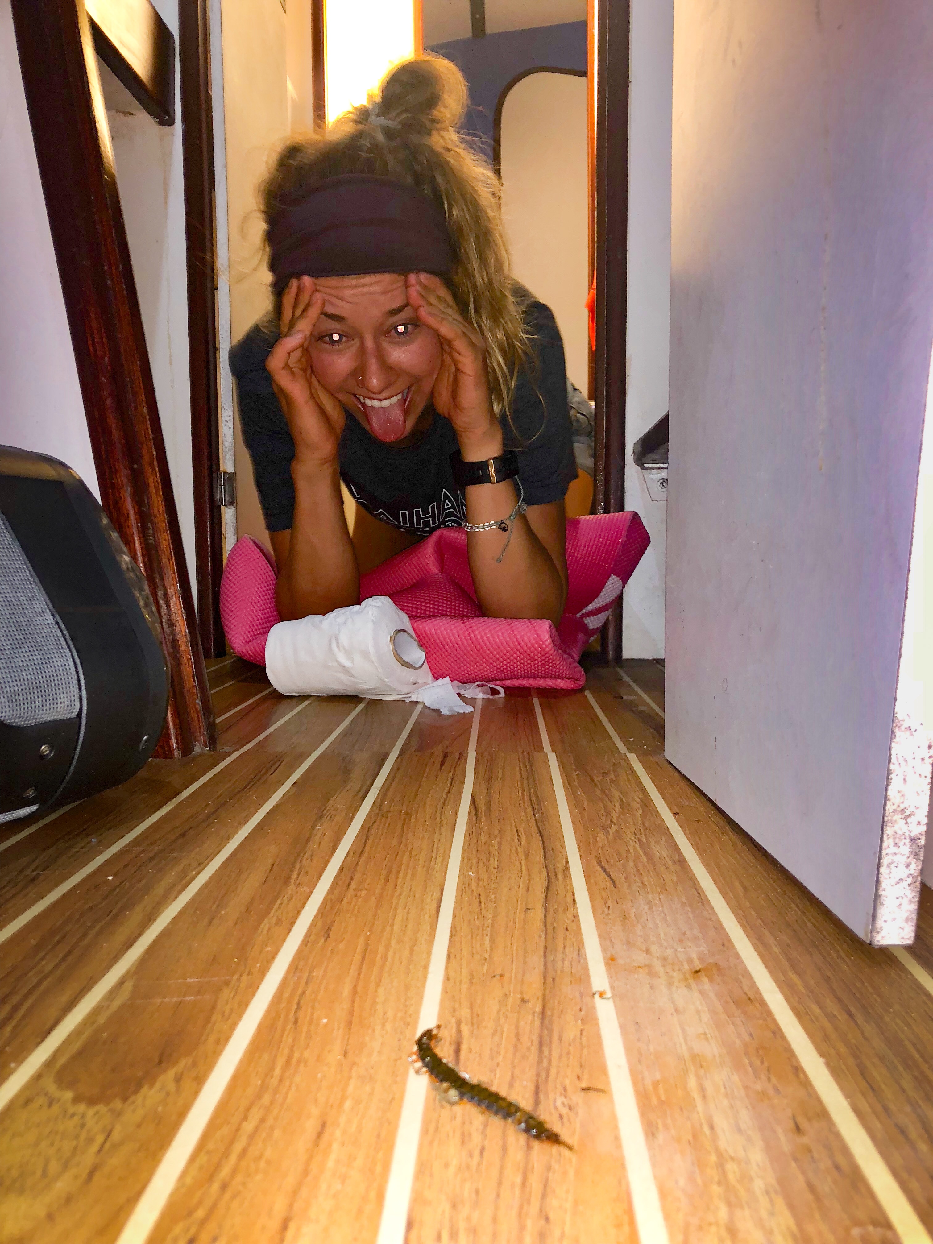 I stood near the steps to watch. Lauren huddled towards the bow, perched on the sink counter. Eric lifted up objects on the floor toward the stern to see where Ted was hiding. Abby pushed past me wielding a dish sponge, ready for the fight. More blood curdling high pitched screams, this time from Eric. A pink yoga mat whizzed past Abby’s face as Eric chased down Ted who slithered lightning fast over the floorboards. He slammed the water bottle down again and again on the molokau. Finally it was subdued enough. Lauren screamed “Get him OFF THE BOAT!”